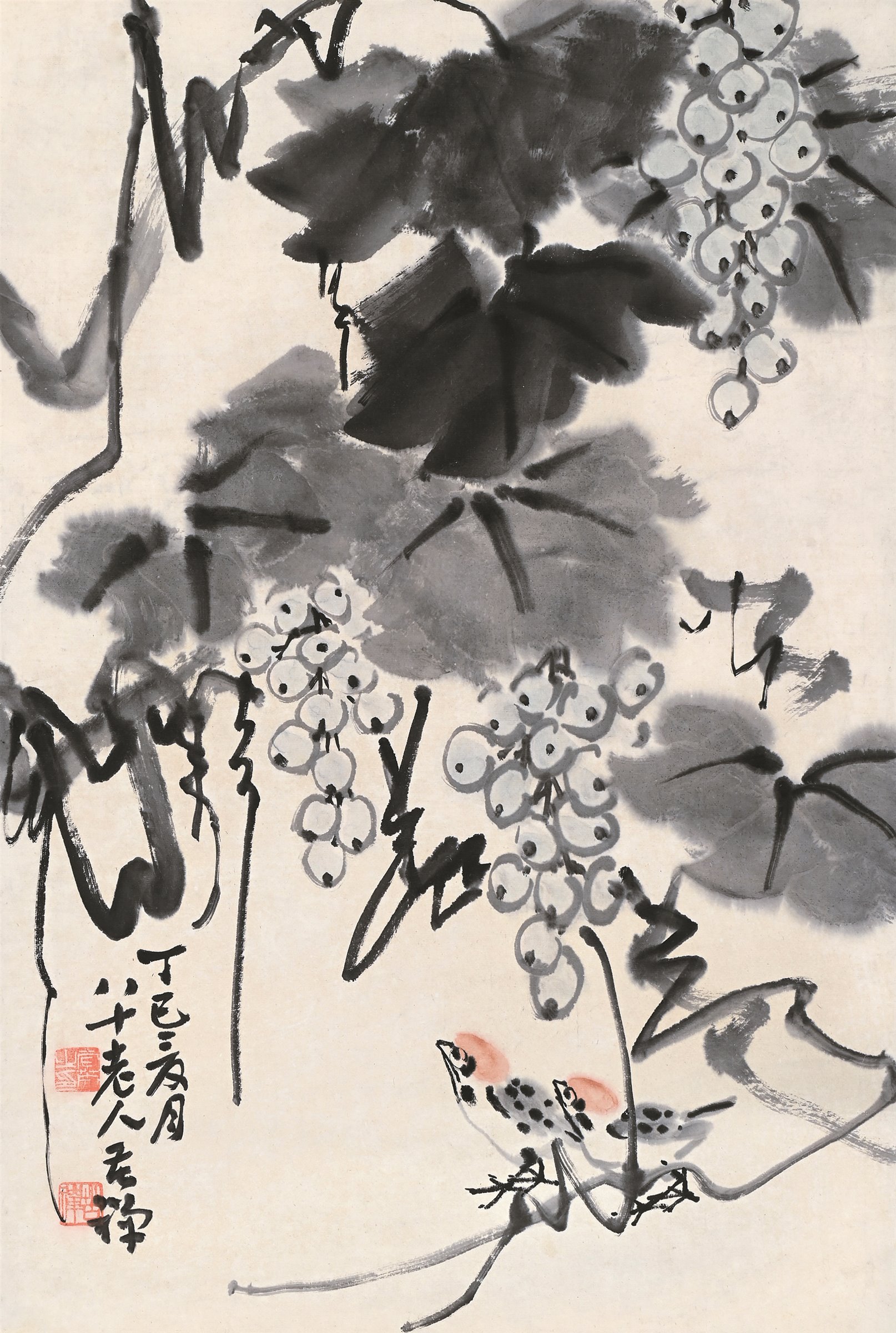 606 李苦禅 丁巳(1977)年作 葡萄小鸟 镜片