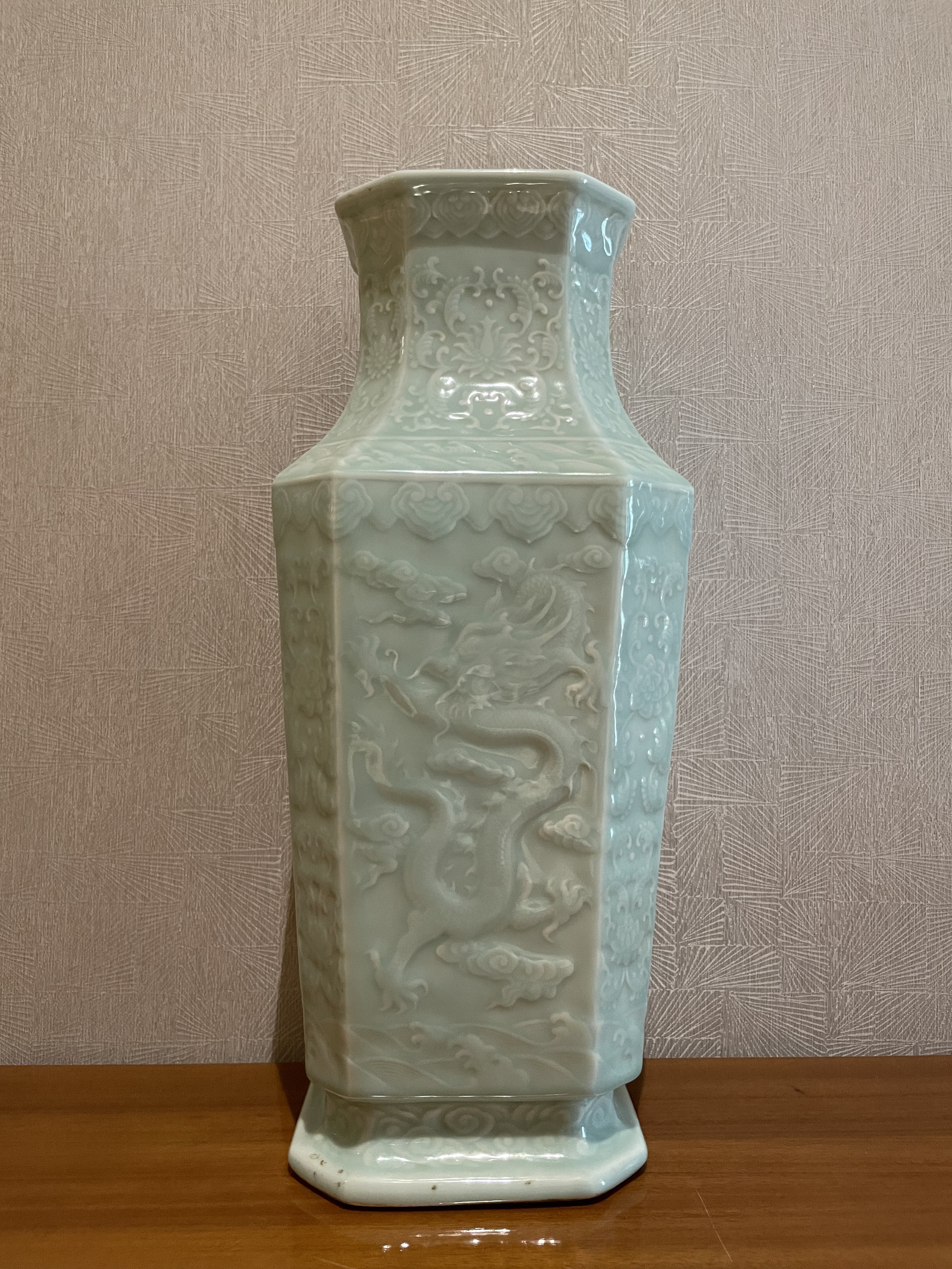 1002 天青釉龙凤纹如意云间四方婑角瓶