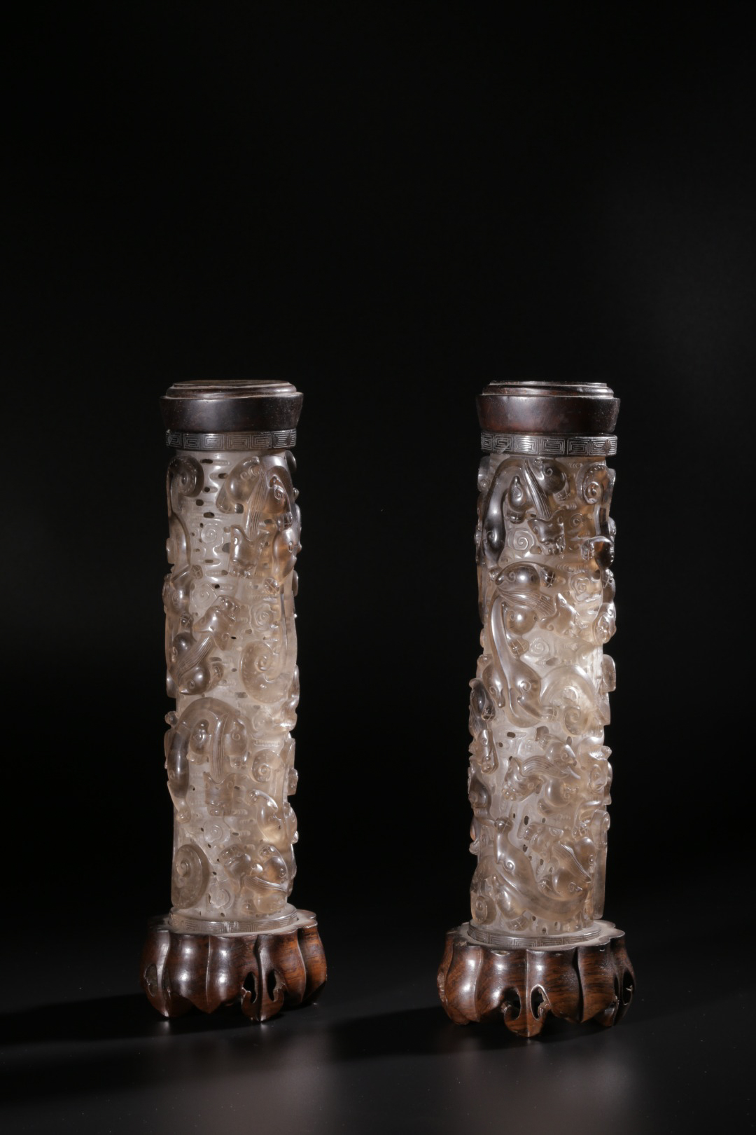 1010 天然茶晶浮雕龙纹香筒一对