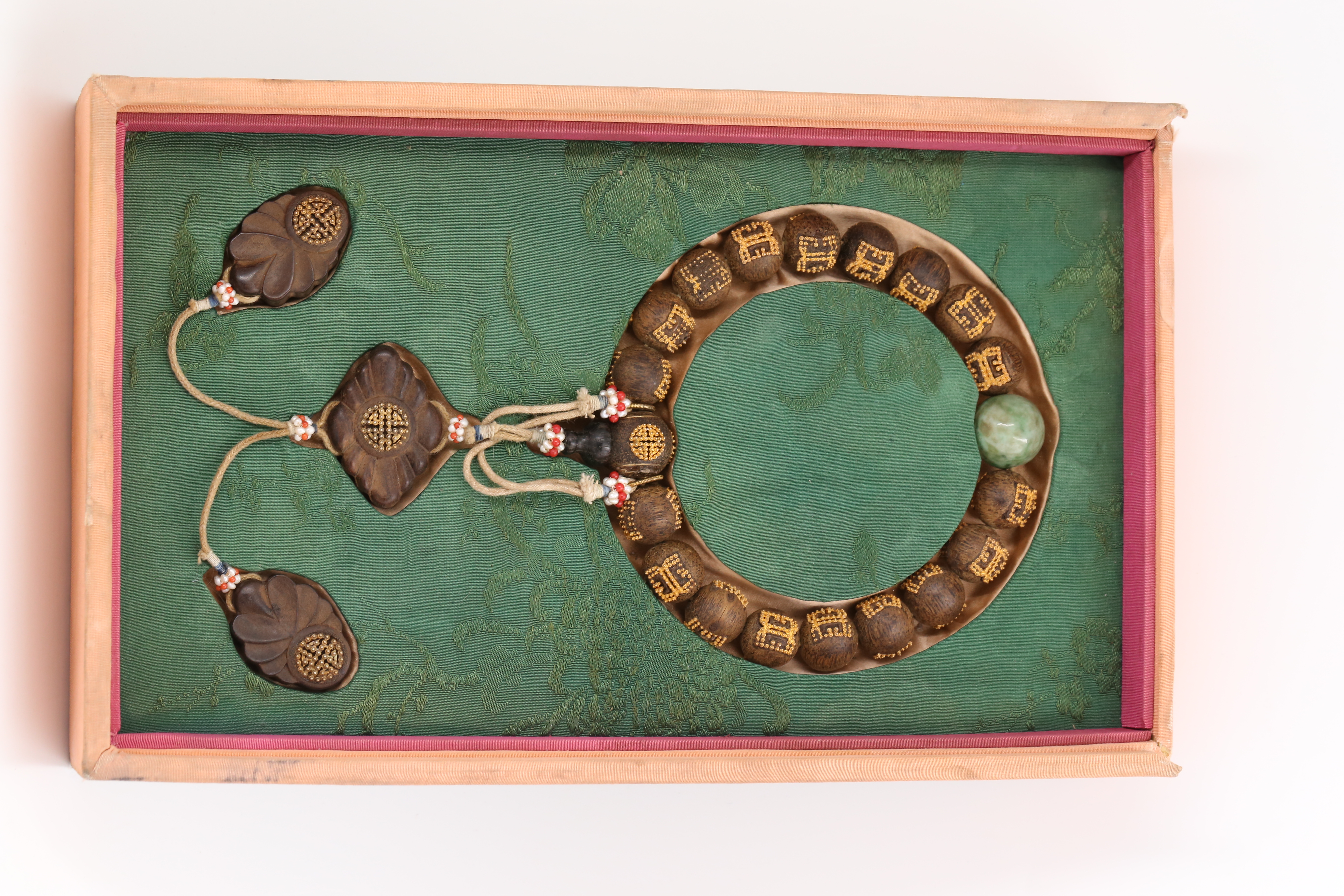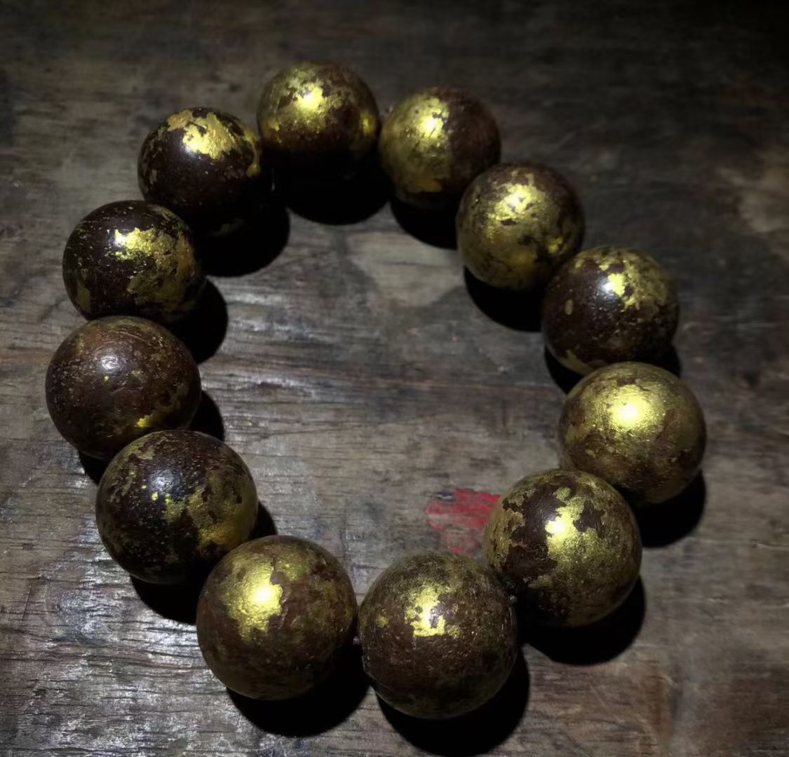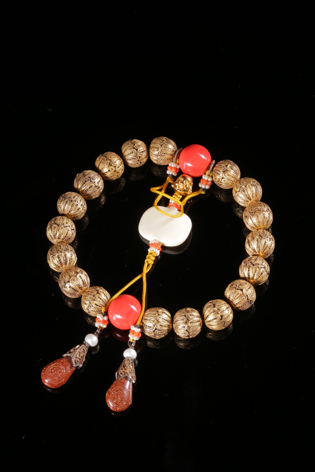 1135 沉香嵌银鎏金团寿纹十八子手持