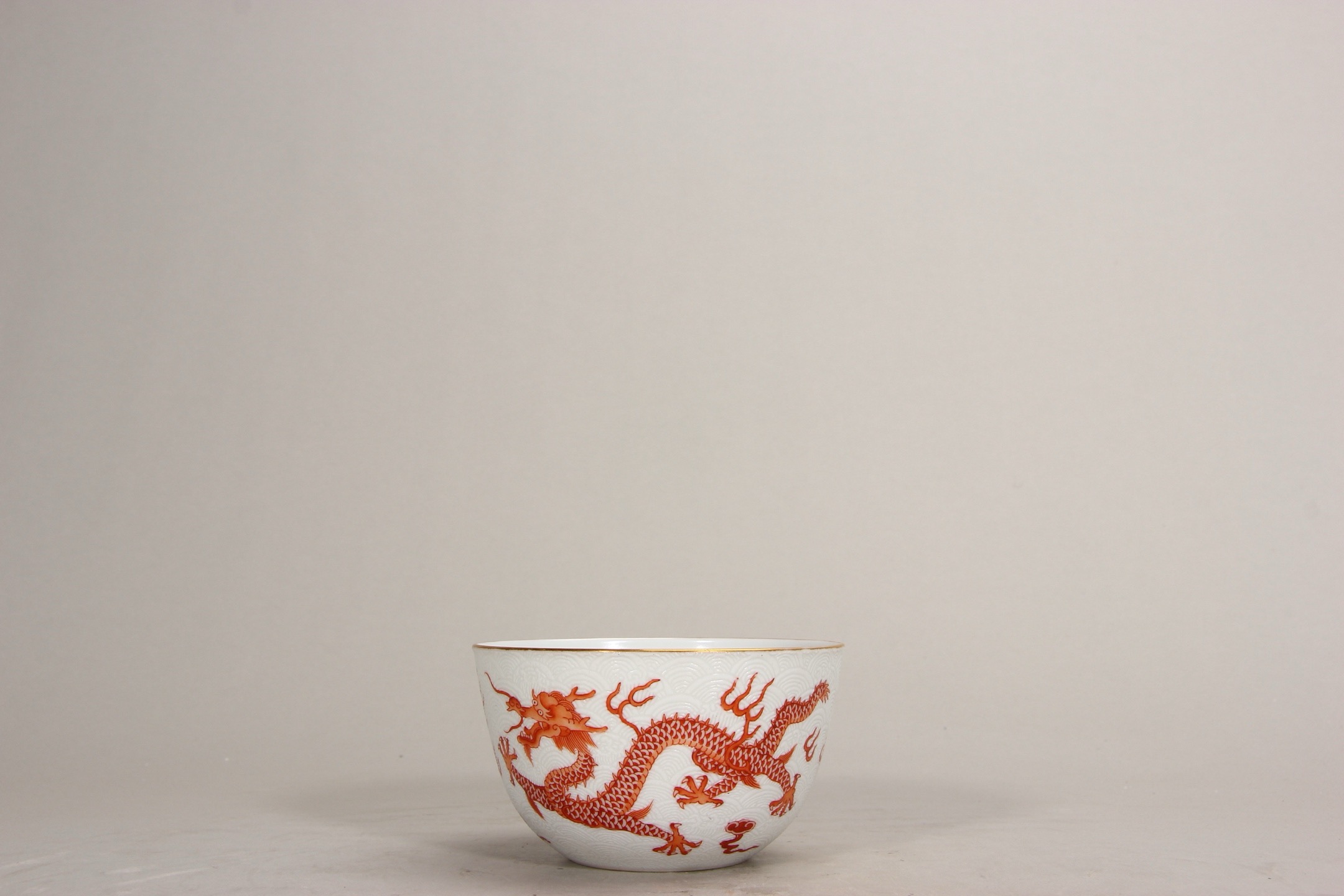 1237 粉白地海浪矾红龙纹卧足茶圆