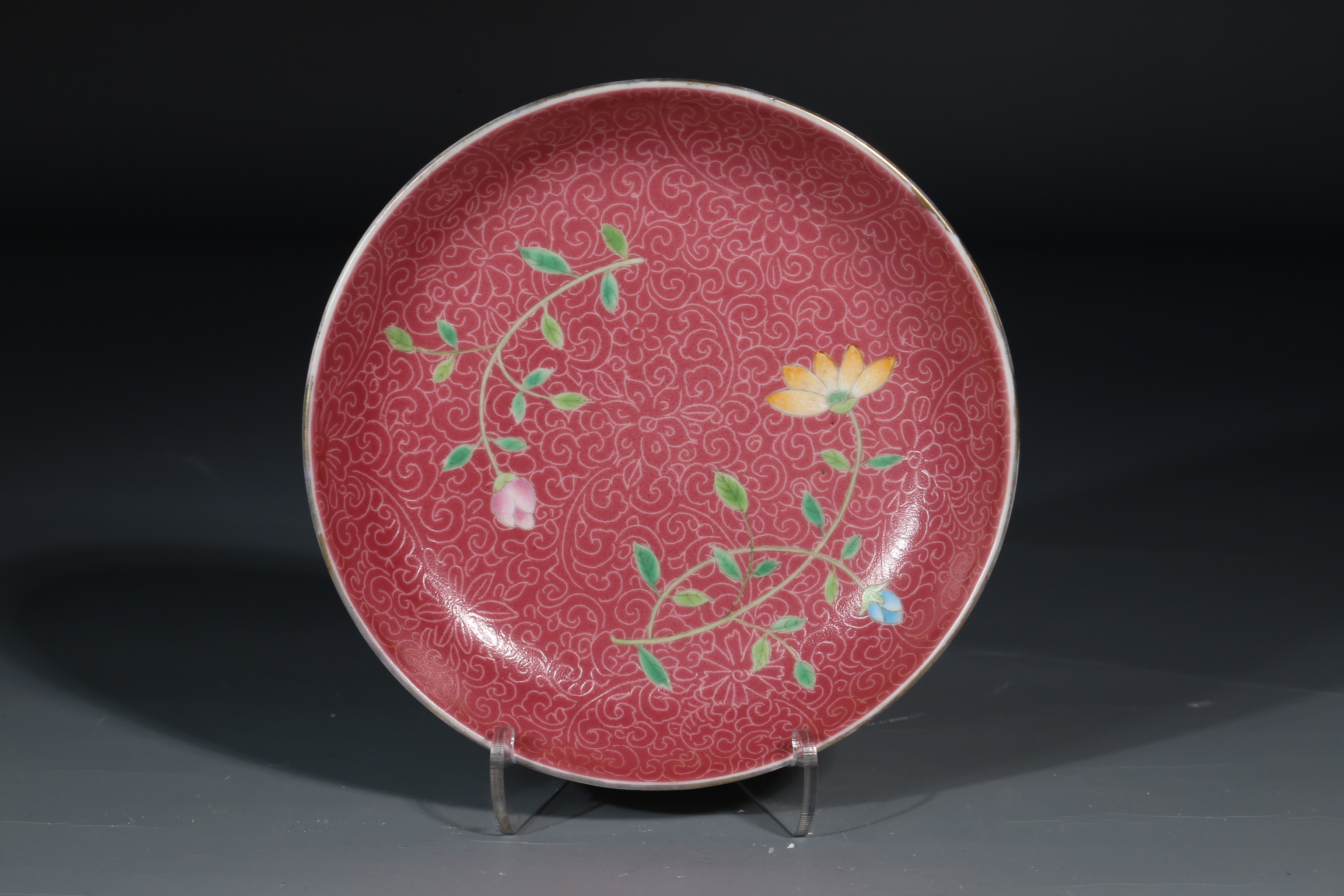 4010 粉彩胭脂红釉轧道花小碟