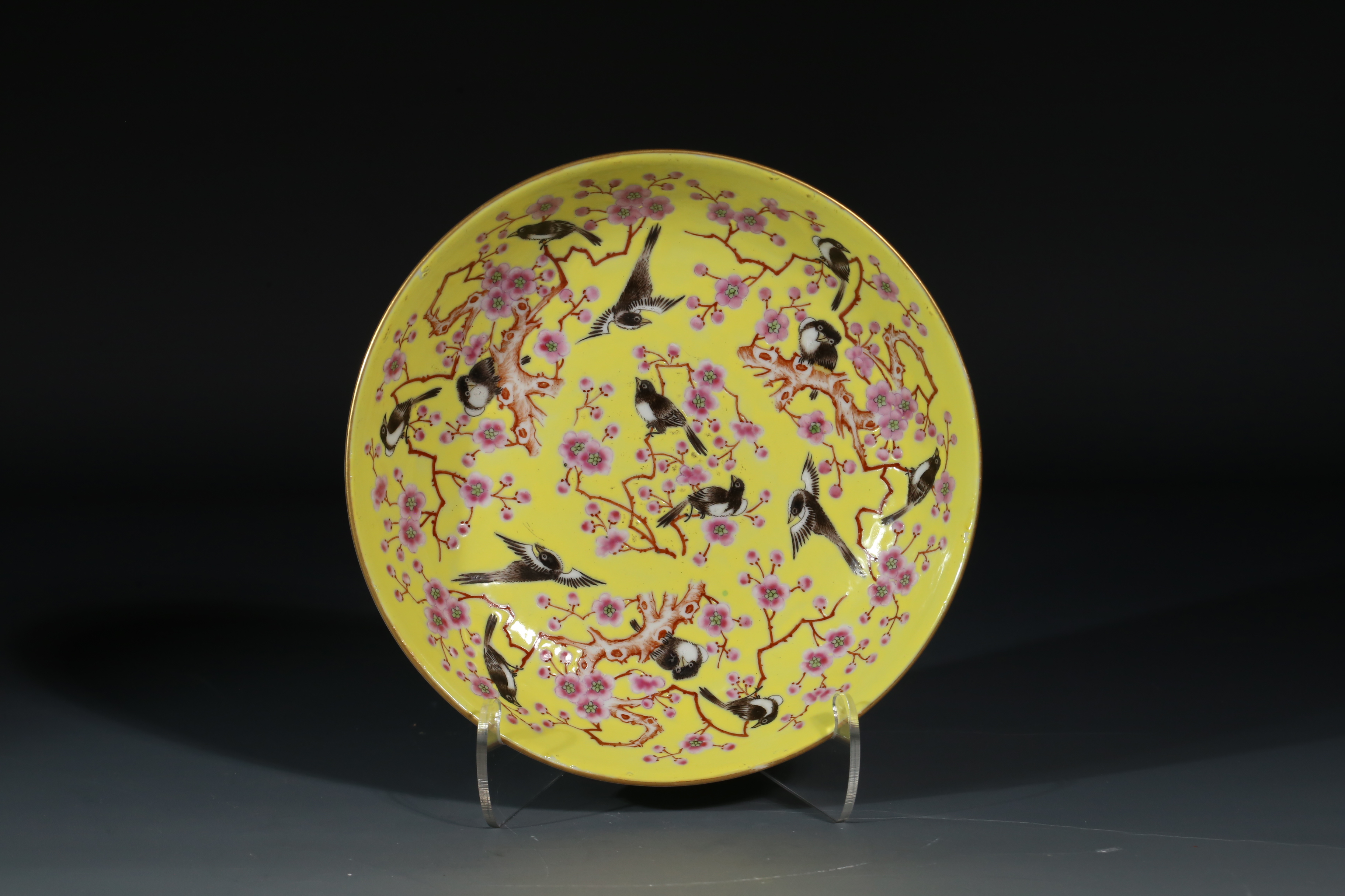 4012 黄地粉彩喜上梅梢盘