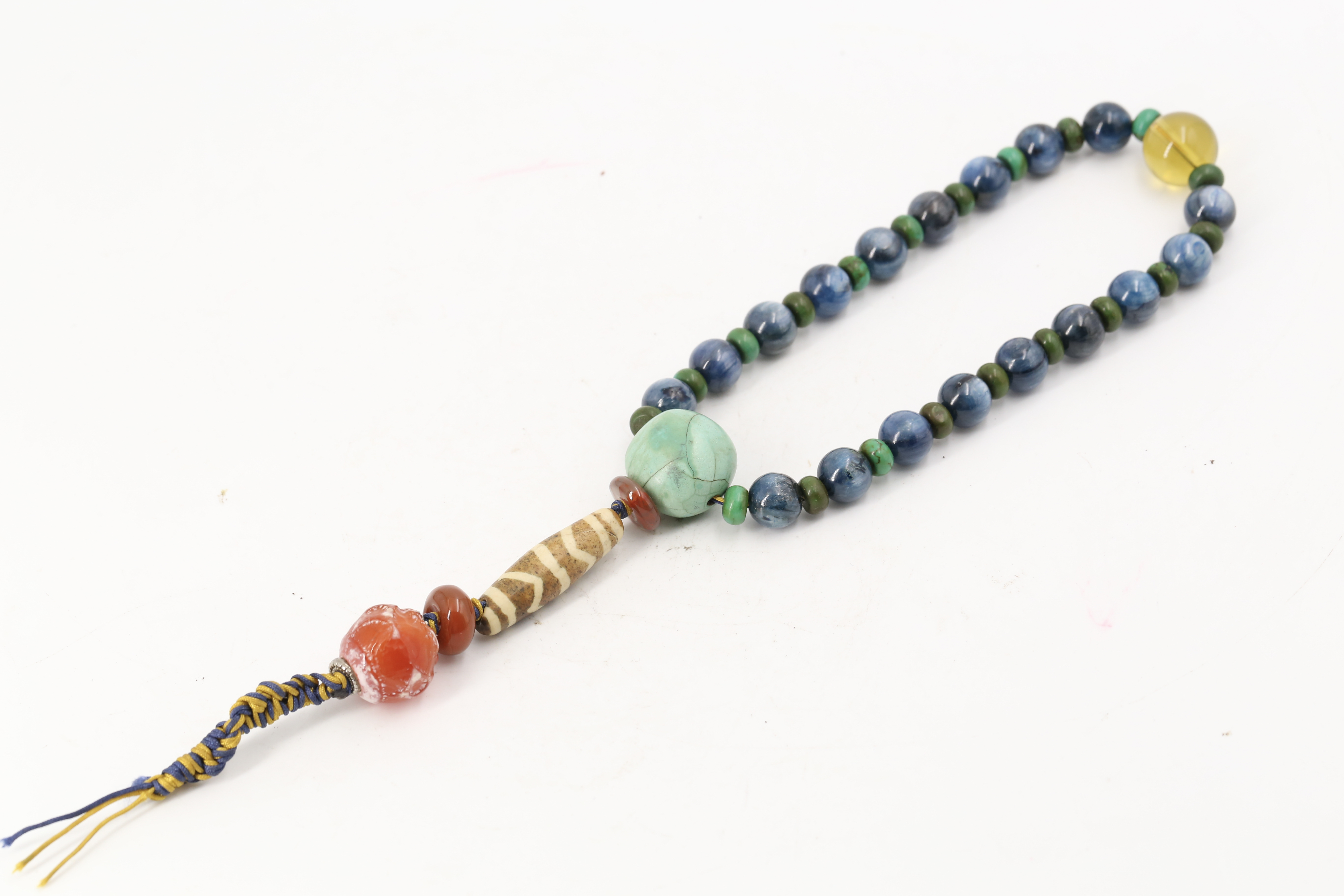 4134 蓝宝石珠配绿松隔珠、老水纹天珠手持