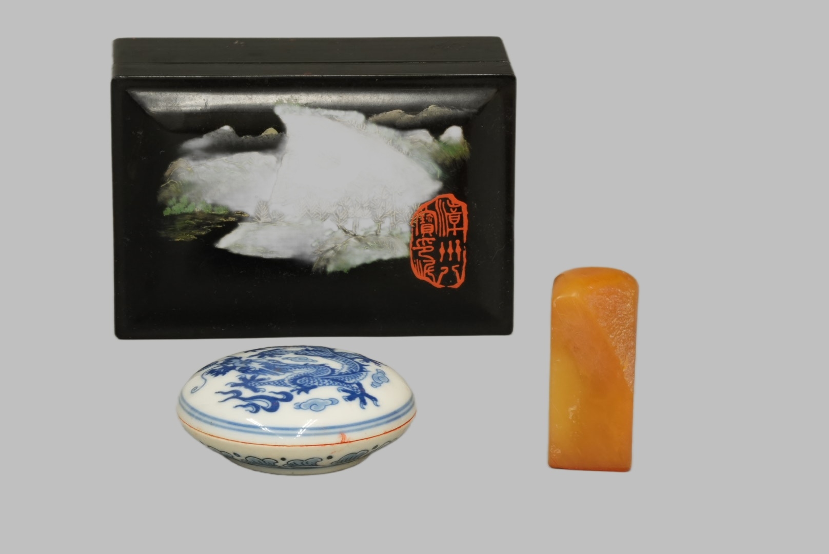 586 清 寿山田黄石印章 青花印泥盒 黑漆印箱