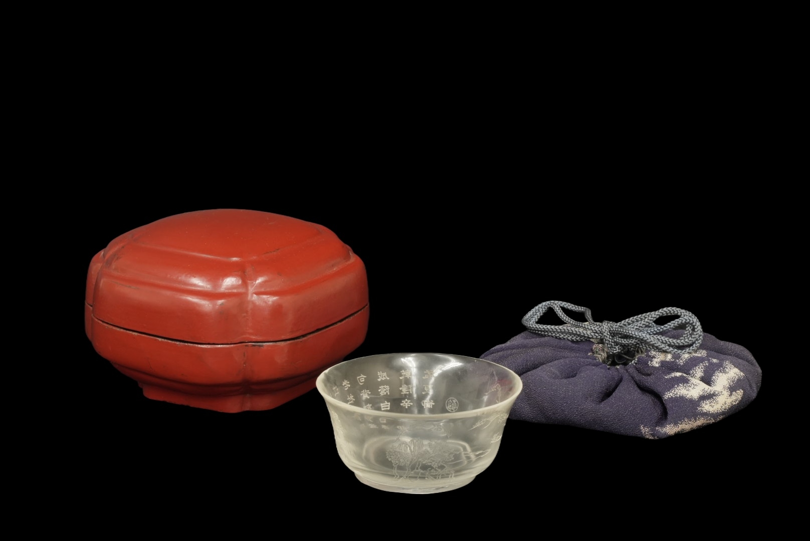 743 清 乾隆年制 山水诗文水晶碗 漆箱附