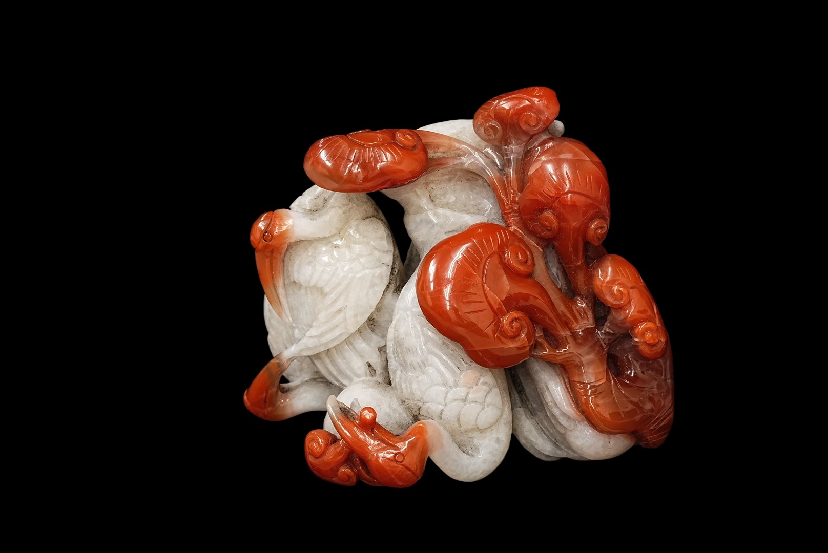 752 清 南红玛瑙喜鹊灵芝型摆件 日本桐箱附