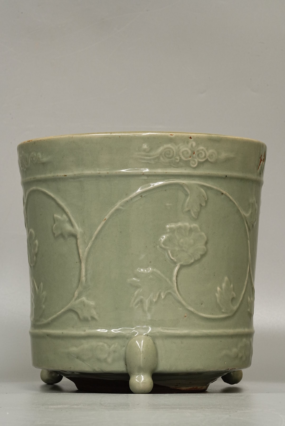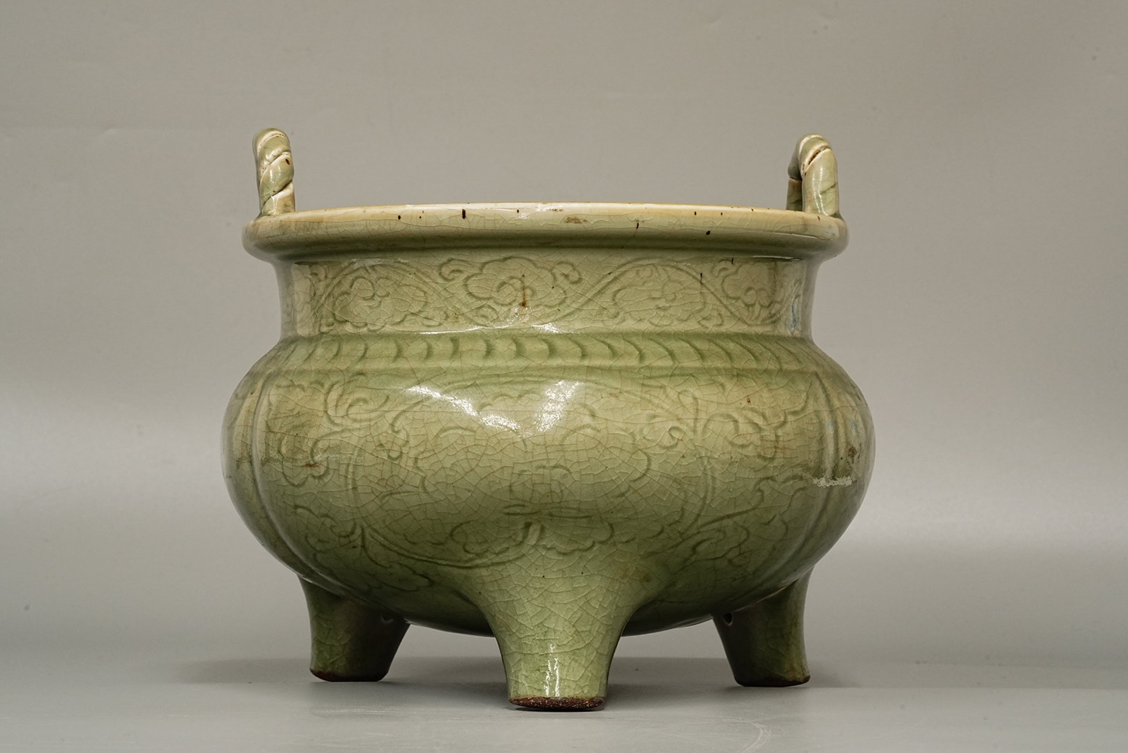 924 明 龙泉青瓷花卉纹三足冲天耳香炉