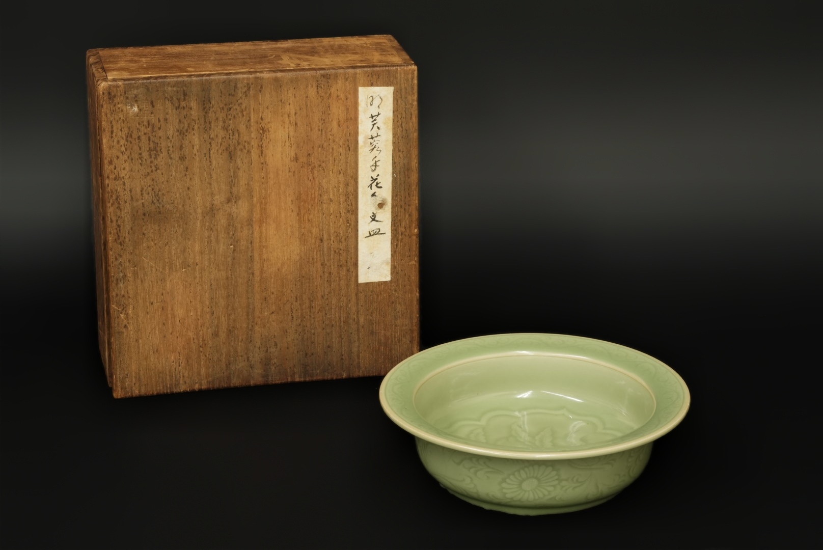 926 明 龙泉青瓷花卉纹折沿洗 日本桐箱附