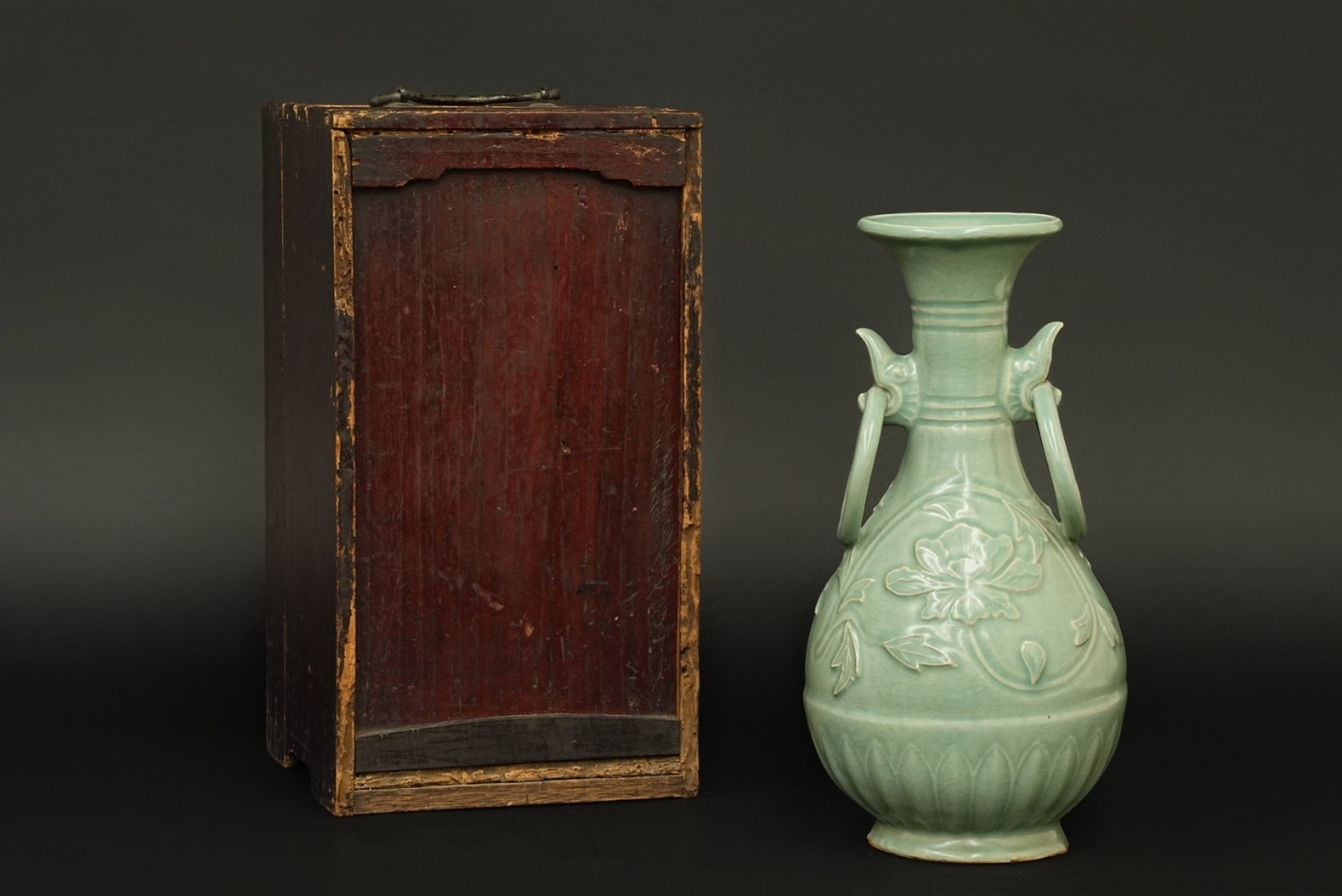 928 明 龙泉青瓷牡丹纹双环耳花瓶 日本桐箱附
