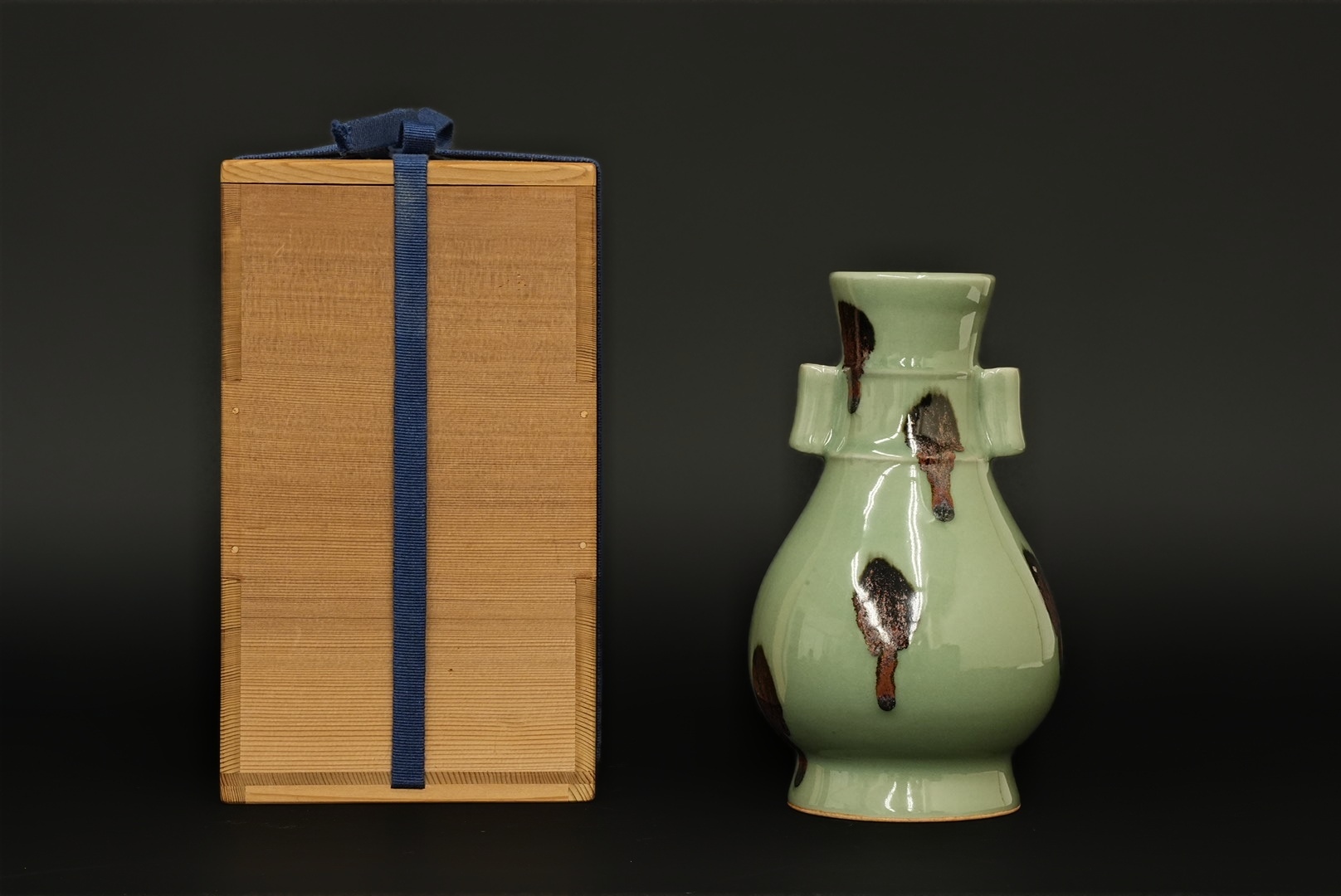 929 明 龙泉青瓷鹧鸪斑贯耳瓶 日本桐箱附