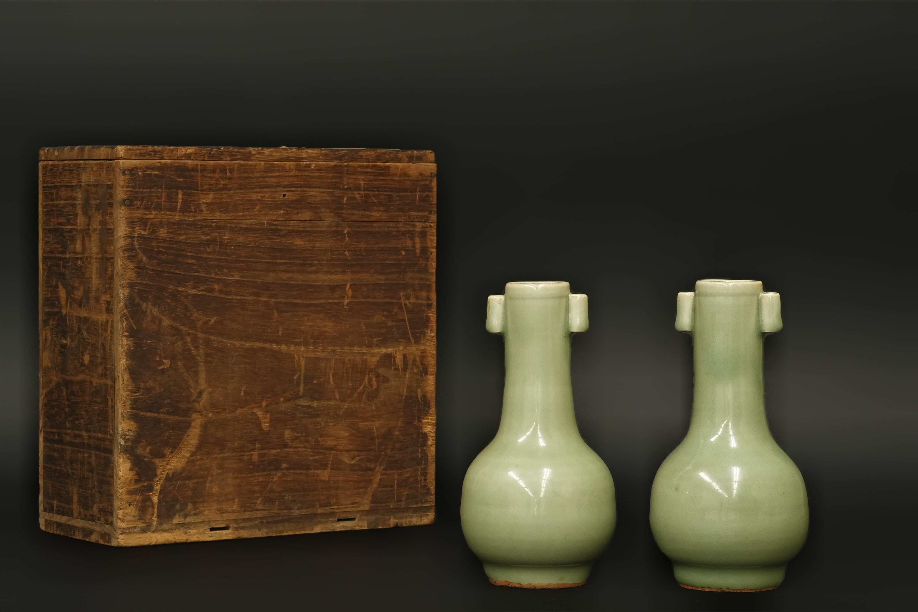 930 明 龙泉青瓷花瓶 一对 日本桐箱附