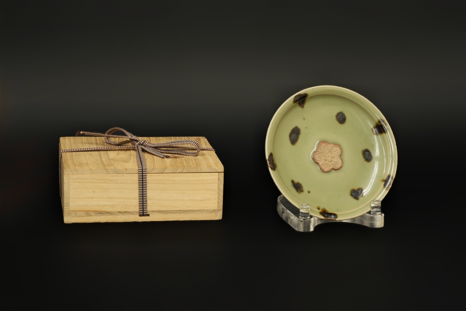 932 明 龙泉青瓷鹧鸪斑花卉纹折沿洗 日本桐箱附