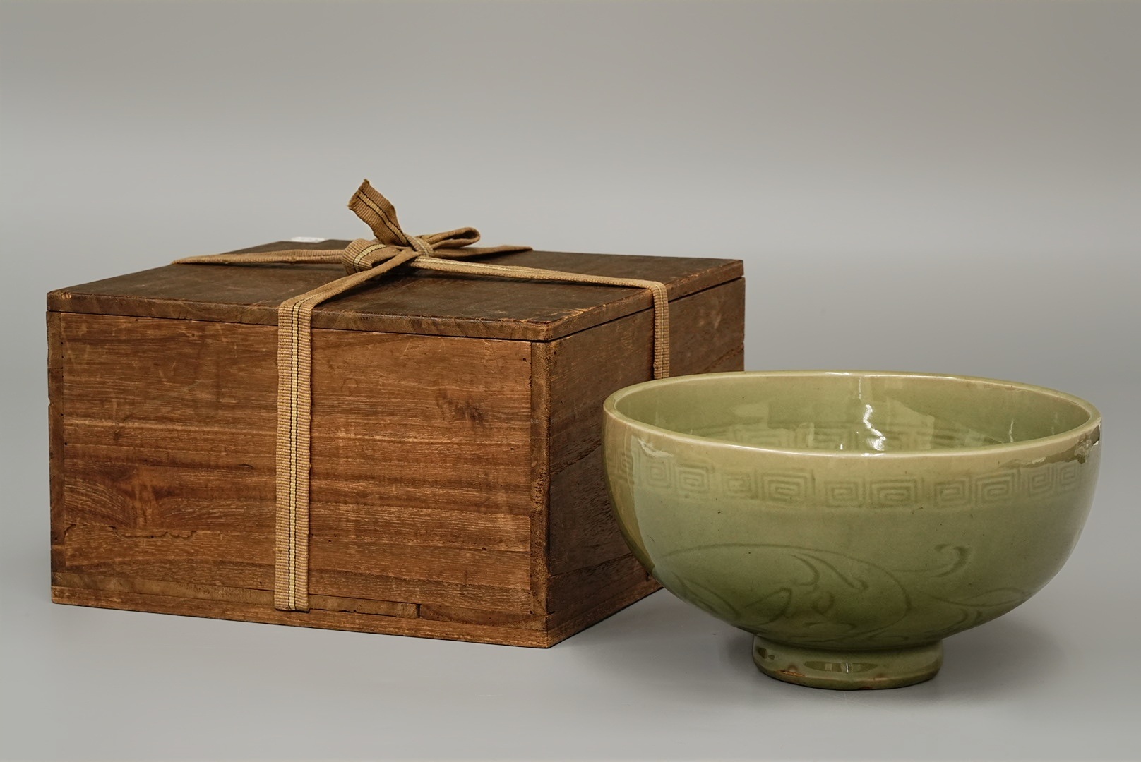934 明 龙泉青瓷花卉人物碗 日本桐箱附