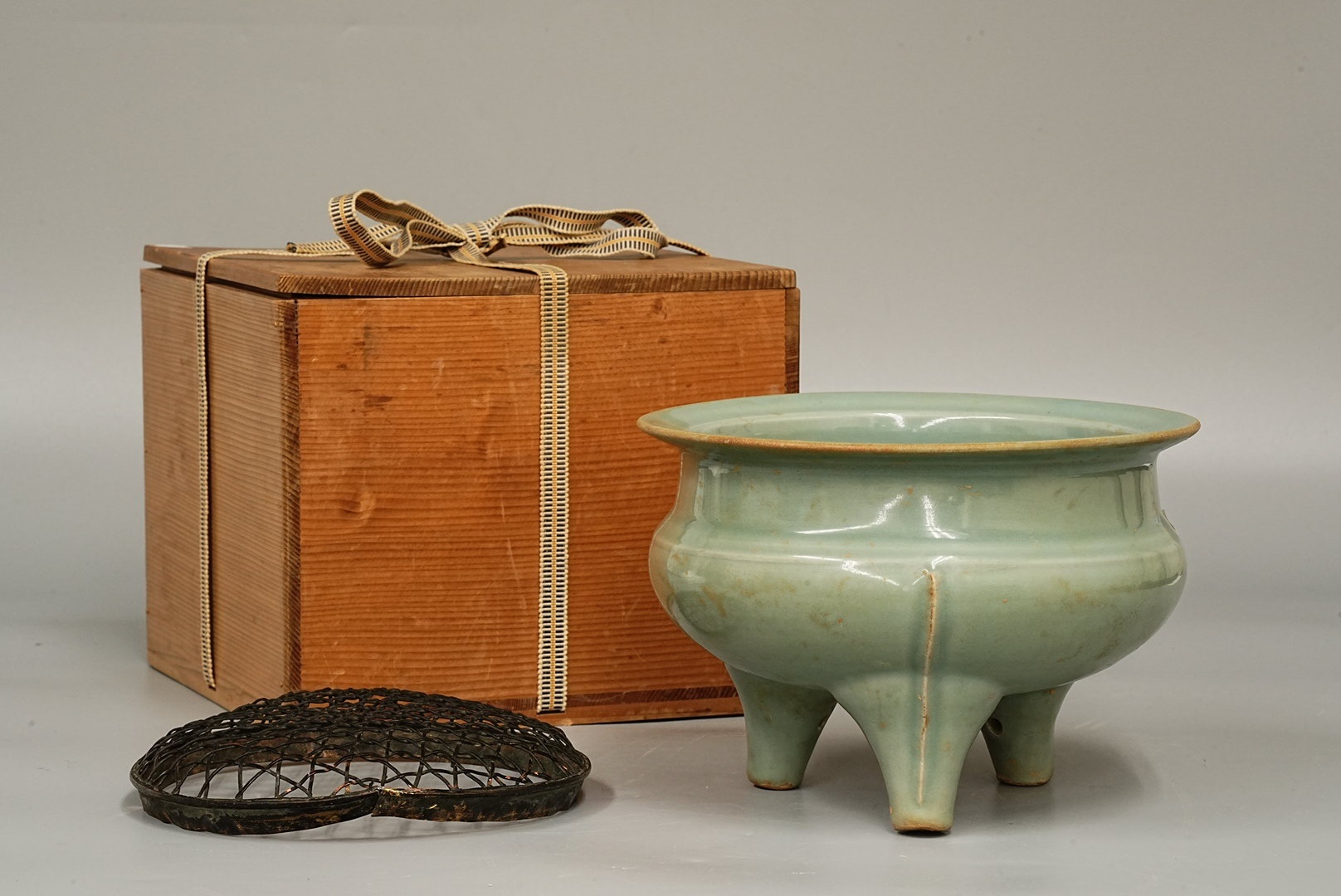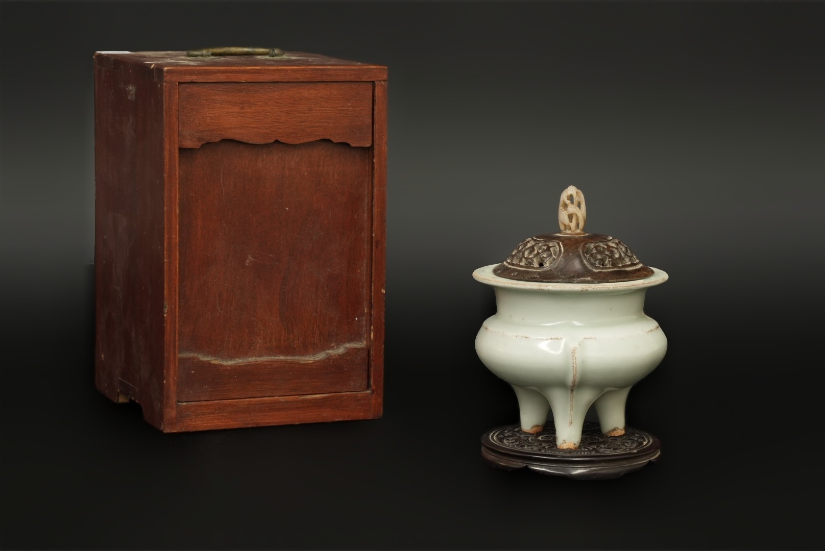 939 宋 龙泉青瓷三足炉 红木托盖附 日本桐箱附