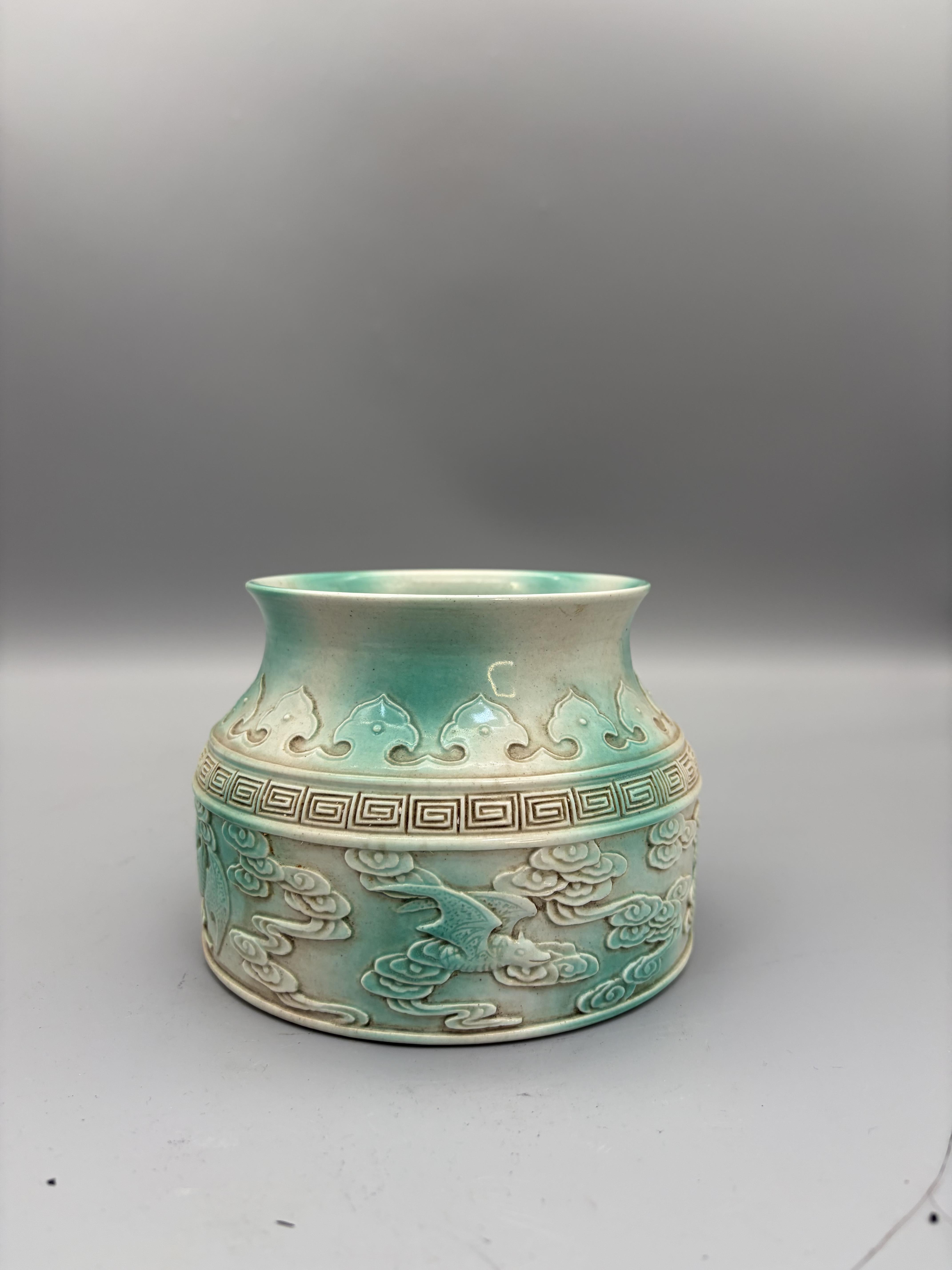 3085 瓜皮绿釉刻瓷云蝠纹笔洗
