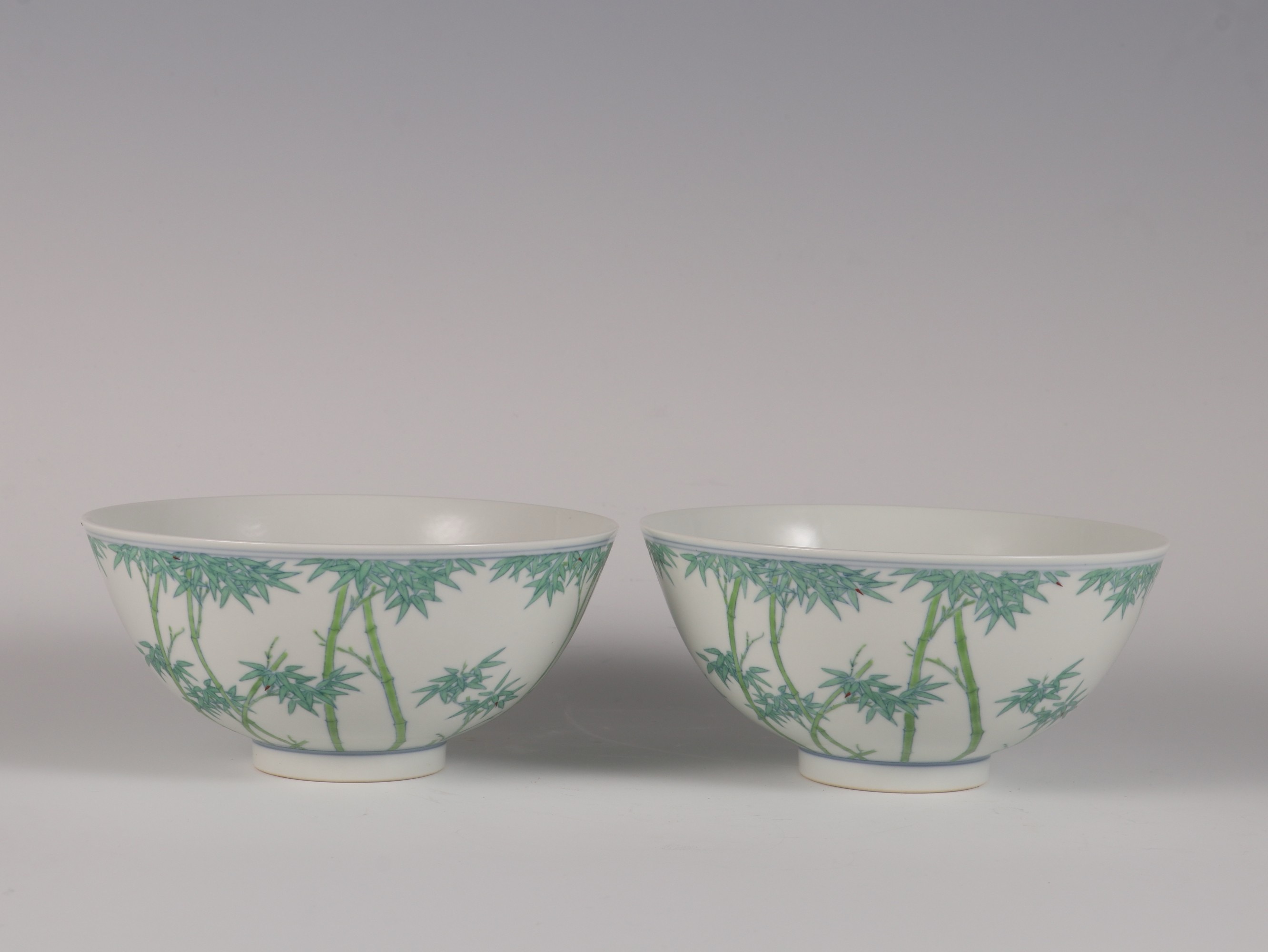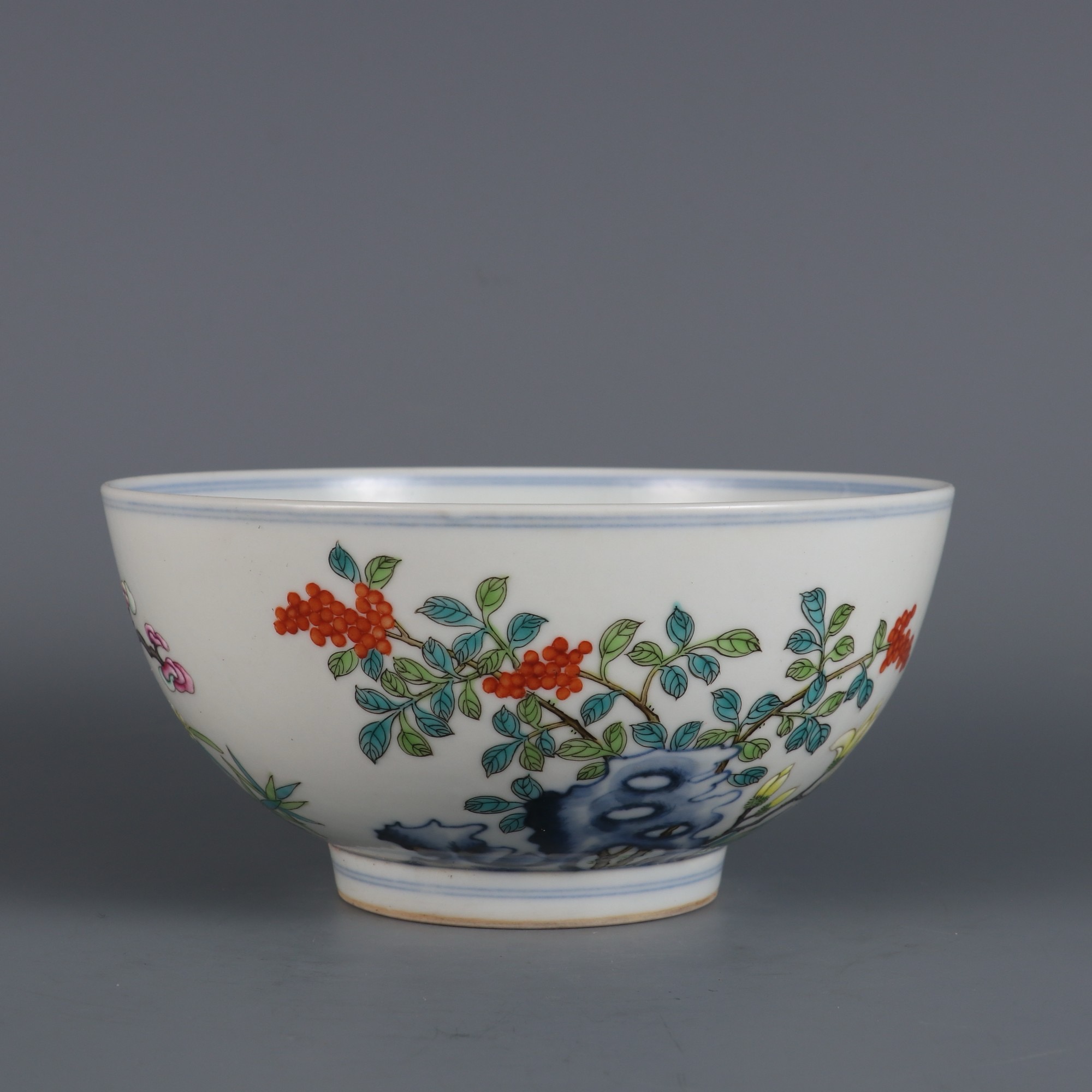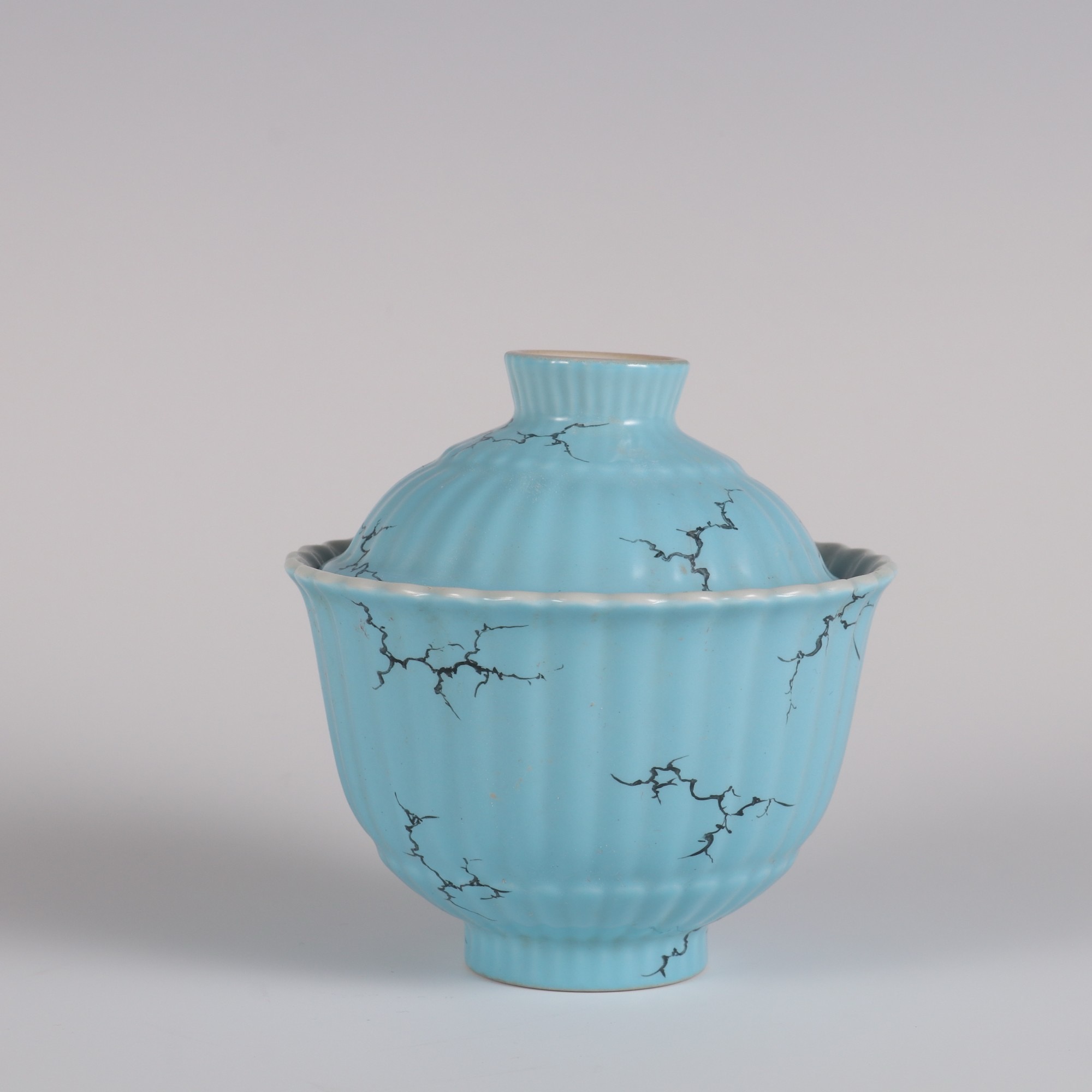 3231 松石绿釉内粉彩杏林春燕瓜菱盖碗