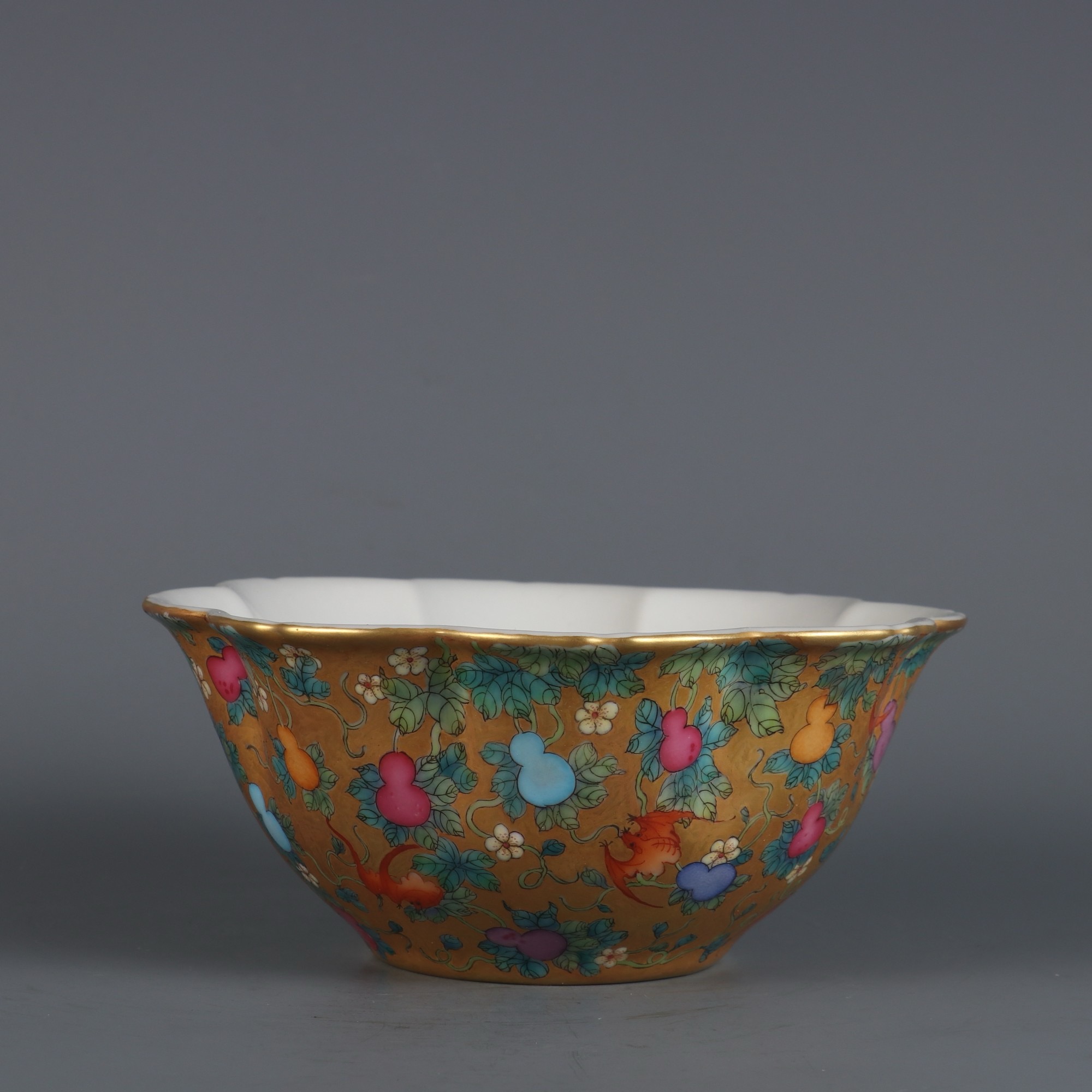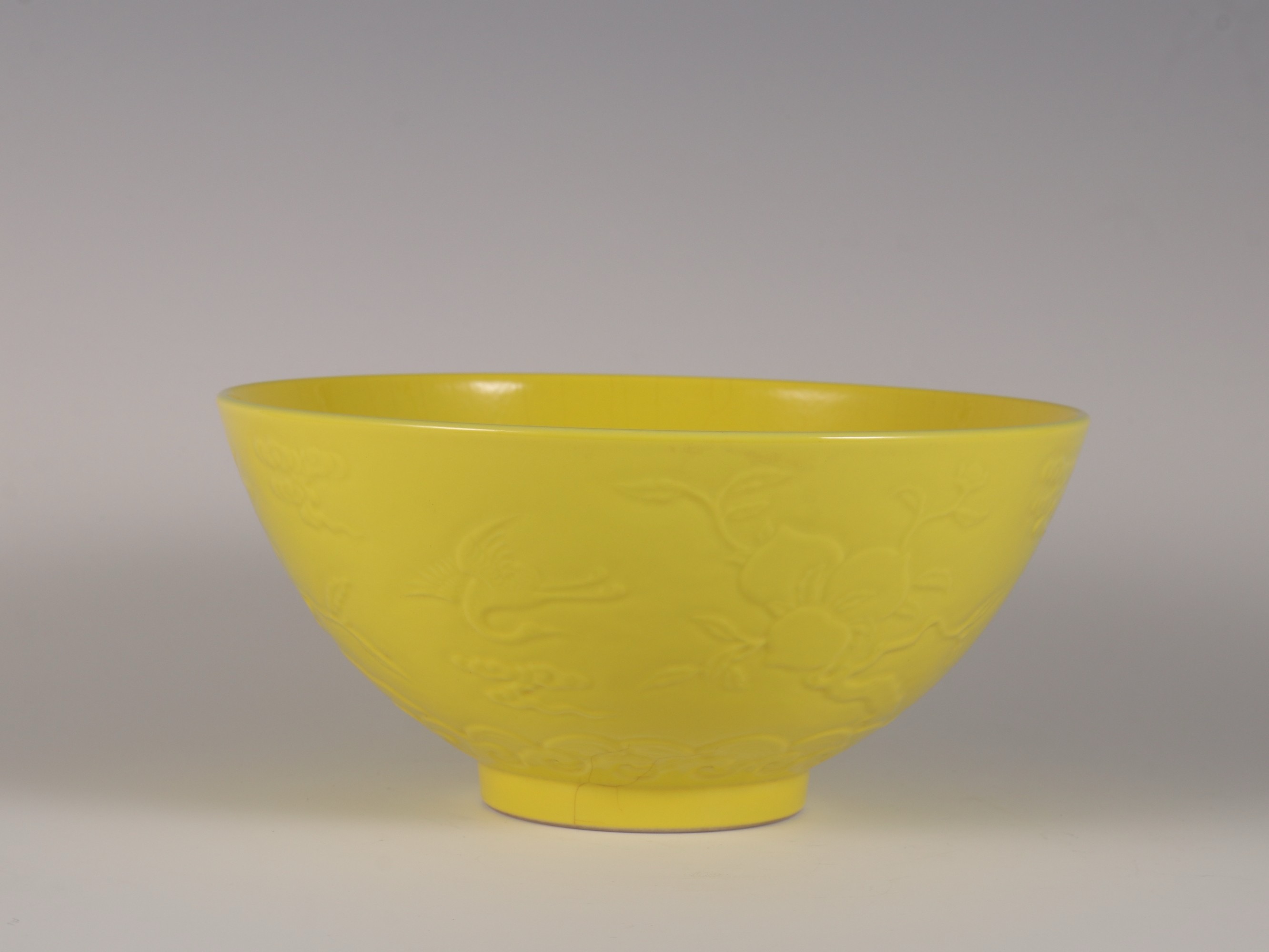 3232 黄釉暗刻贺寿图内粉彩蟠桃纹大碗