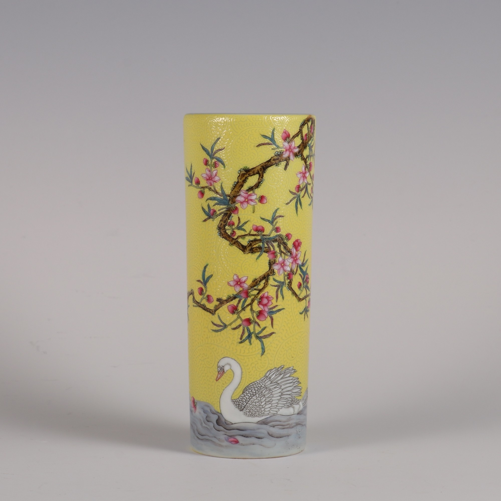 3230 年制黄地扒花珐琅彩花鸟题诗笔筒