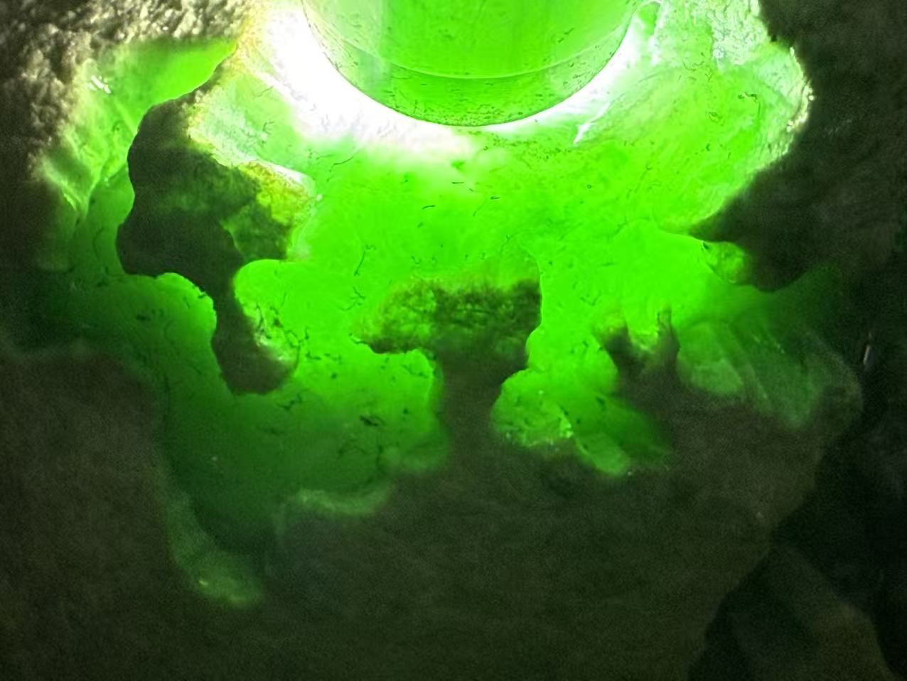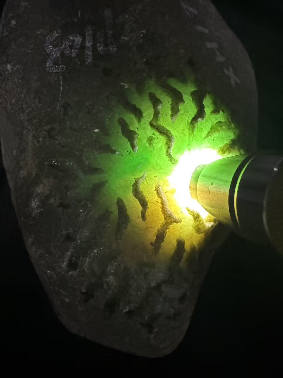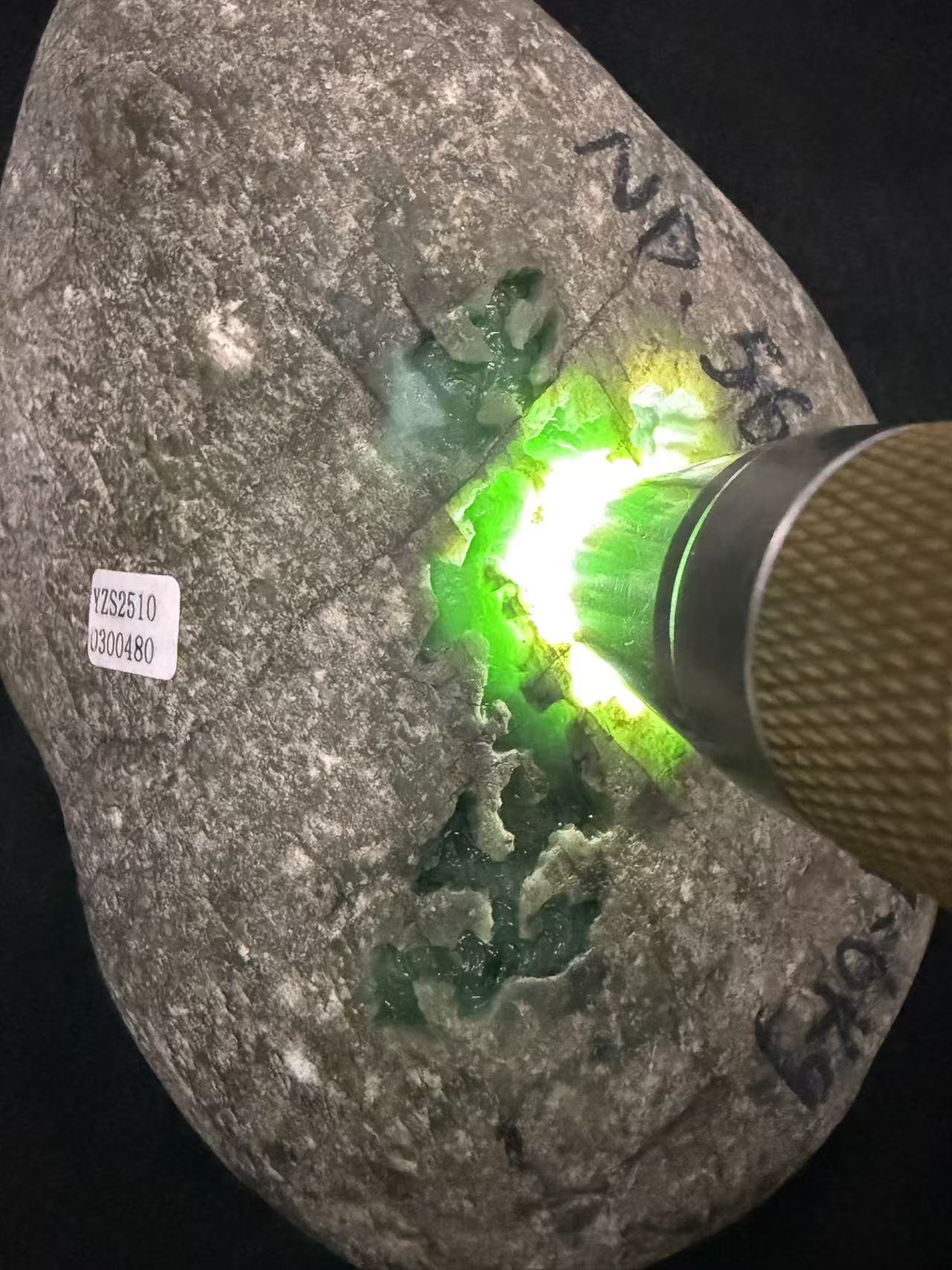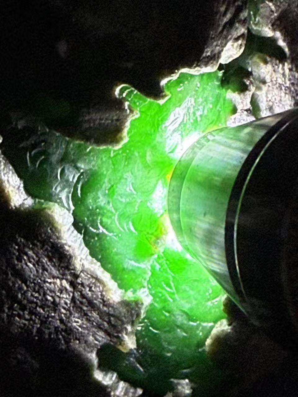 10 来自于老坑后江敞口,开窗处表现为辣阳绿,整体料型完美,有满色挂件界面位,重量:1620克
