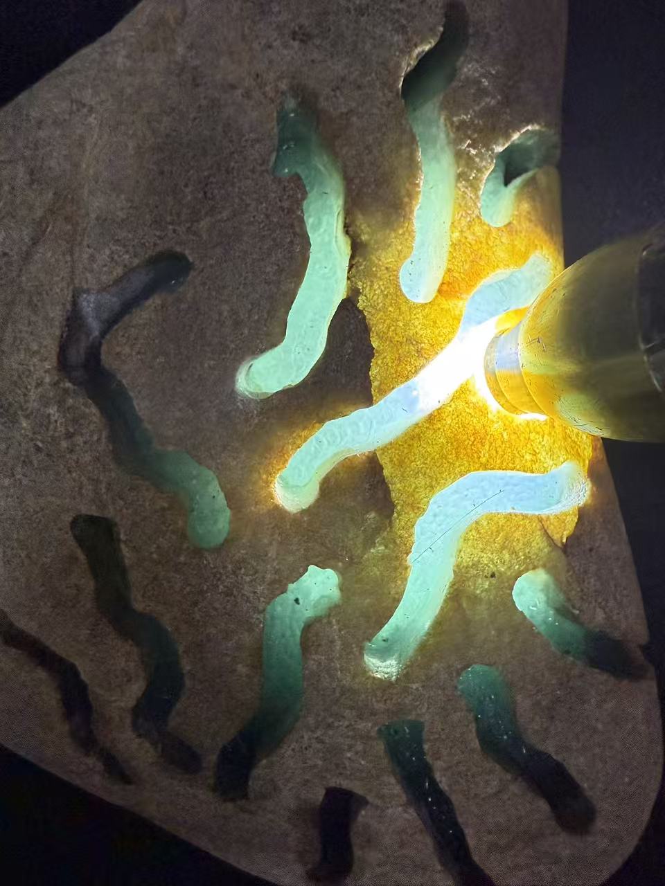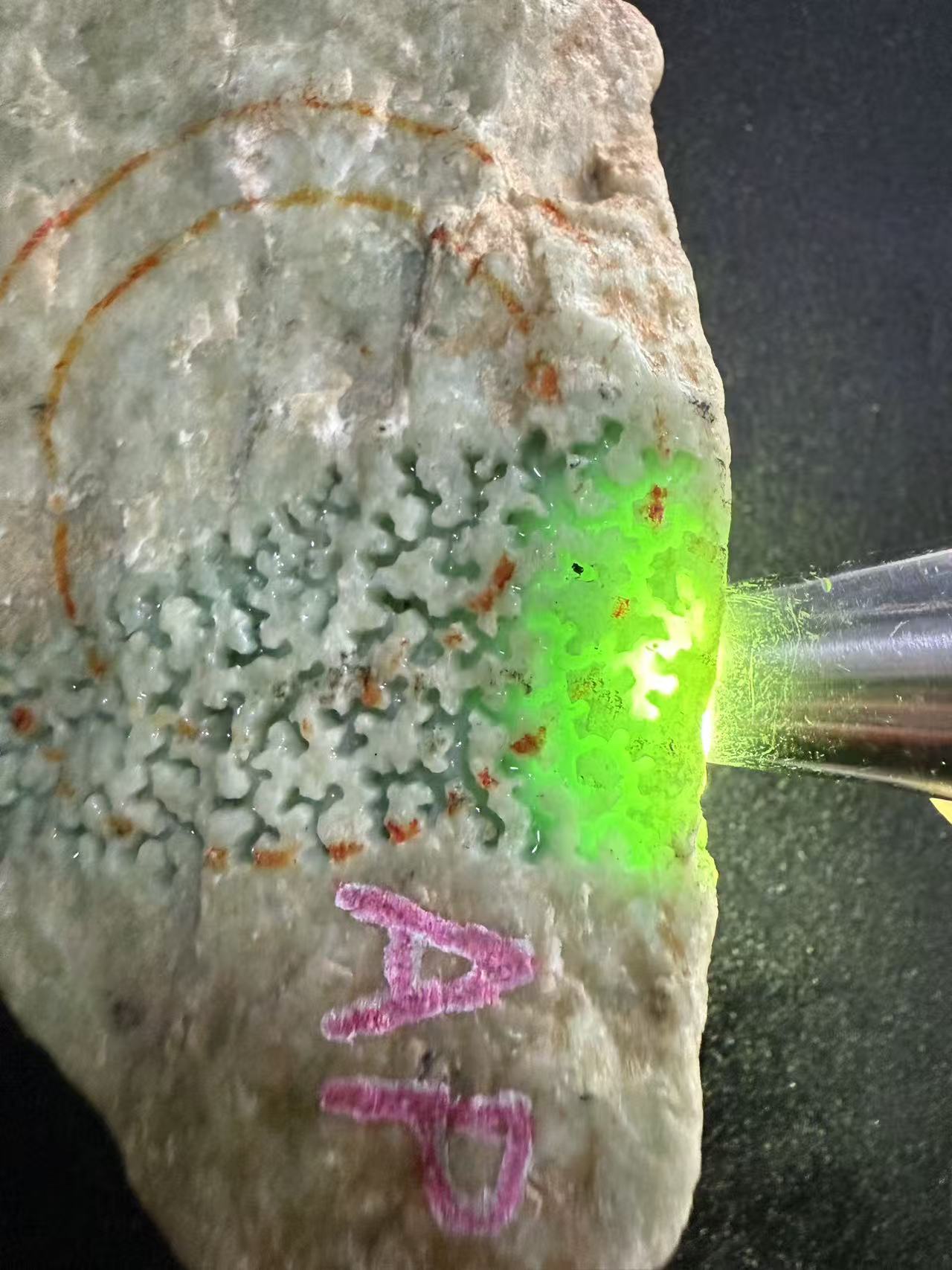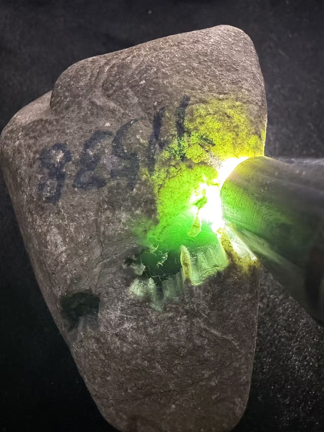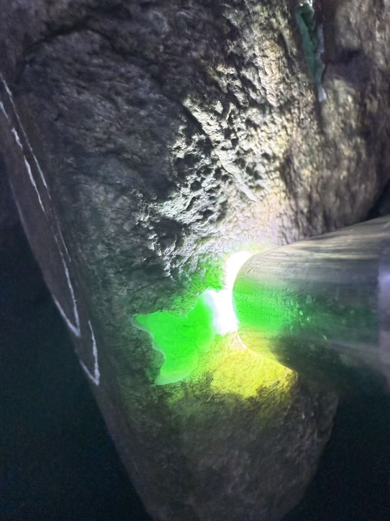10 来自于老坑后江敞口,开窗处表现为辣阳绿,整体料型完美,有满色挂件界面位,重量:1620克