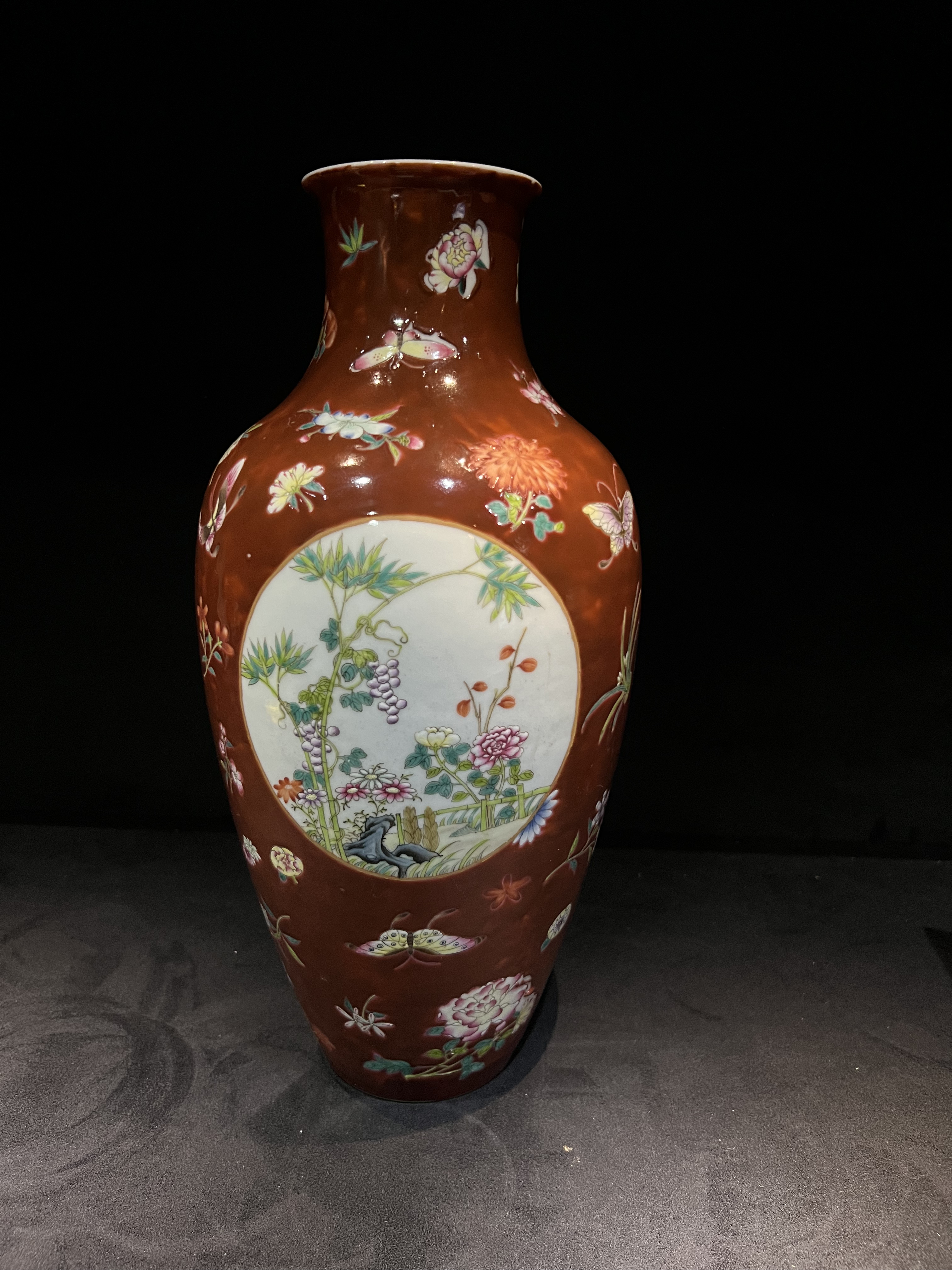 4239 珊瑚红底开窗粉彩花鸟瓶