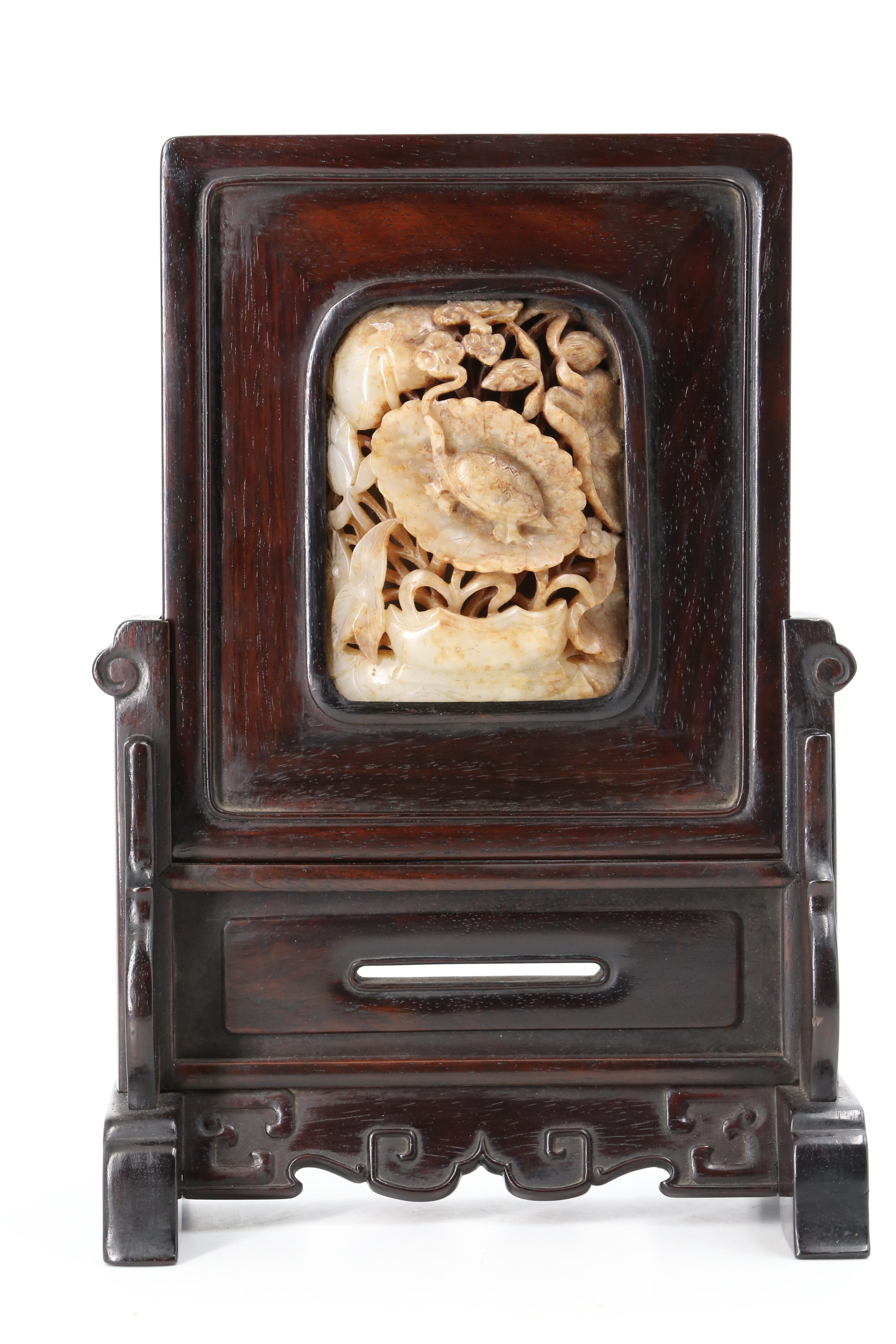 2005 红木嵌白玉籽料镂雕莲龛丹龟纹砚屏