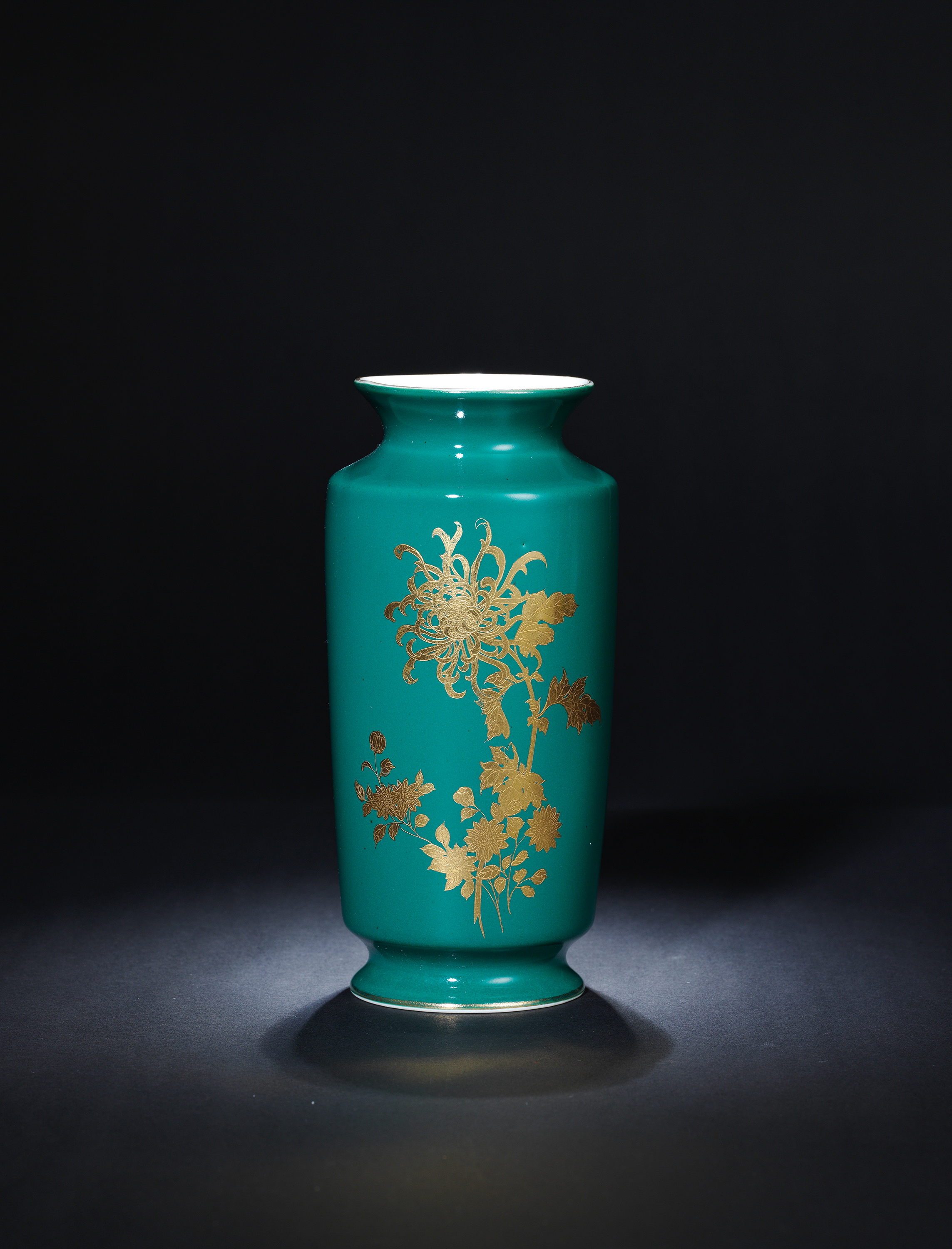 8019 高温关公绿釉腐蚀金菊花图棒槌瓶