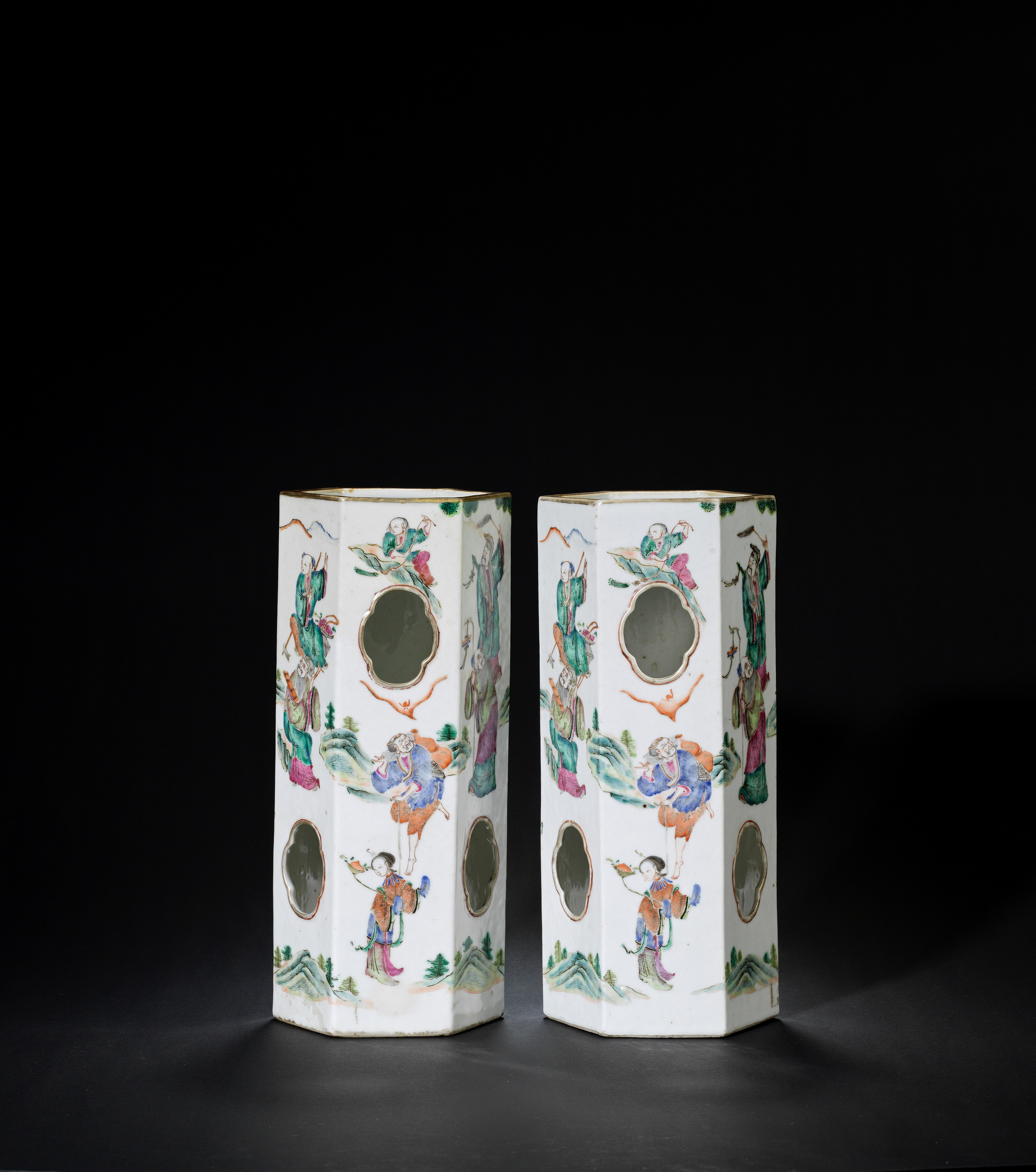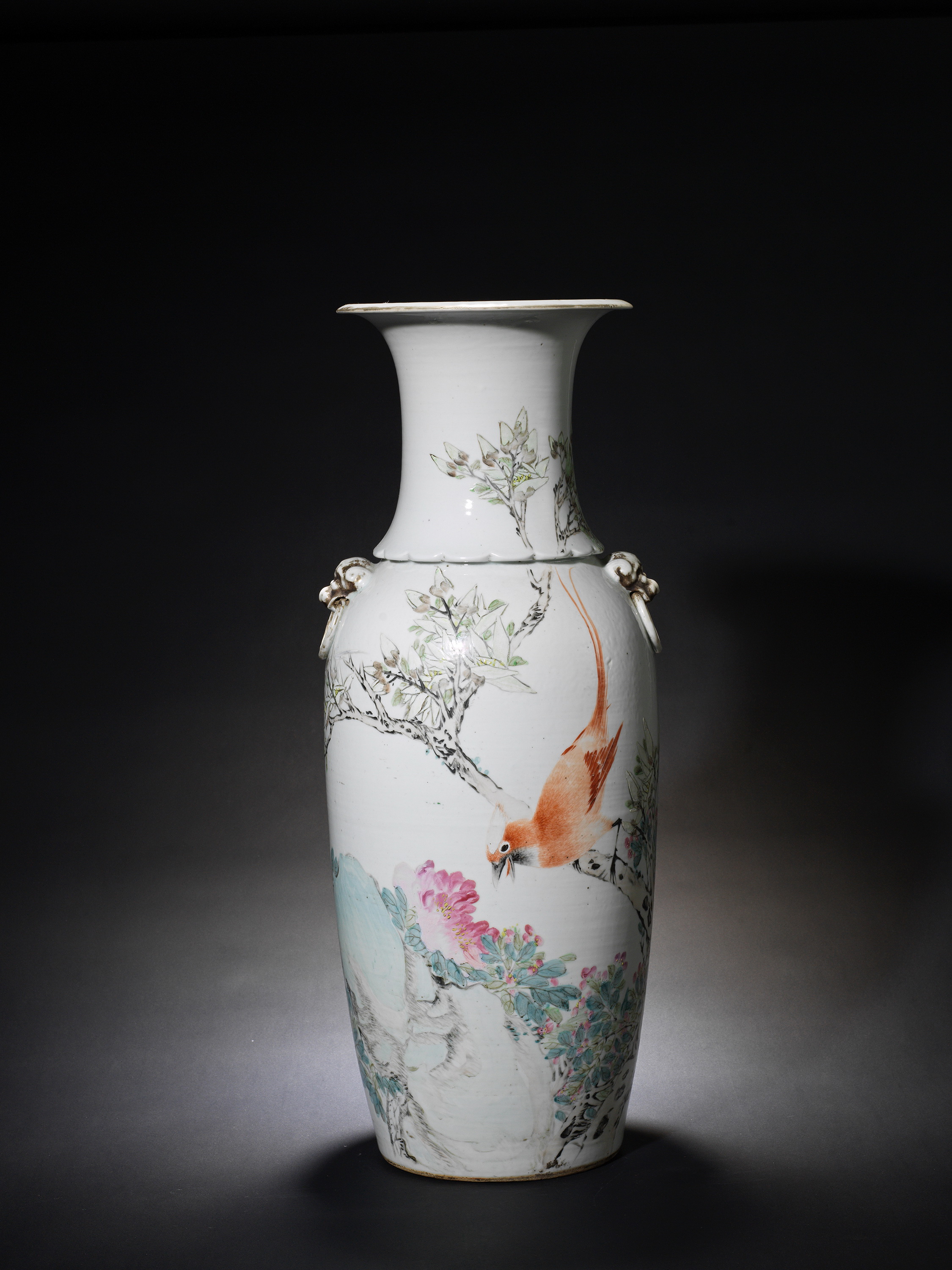 8311 梅峰樵浅绛彩花鸟帽筒一对