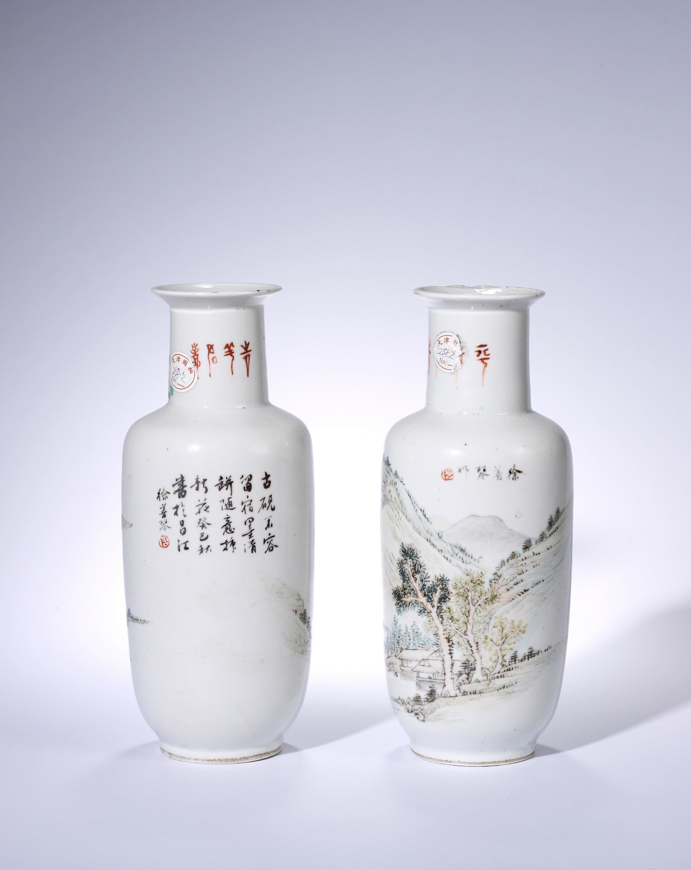 8313 徐善琴浅绛彩山水棒槌瓶一对