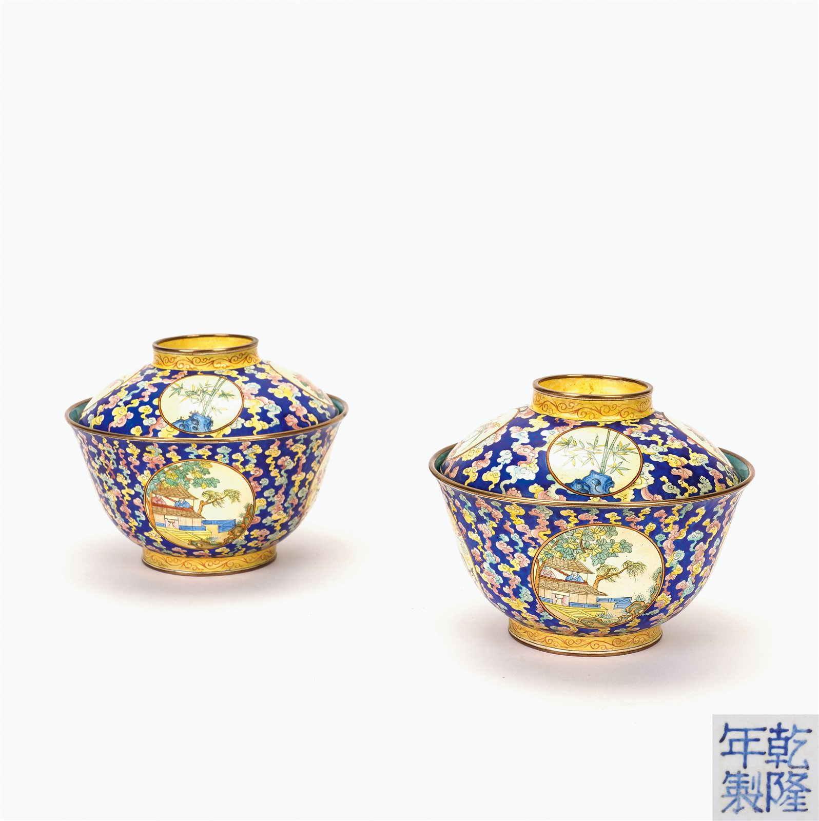 154 铜胎画珐琅开光山水人物花卉盖碗一对