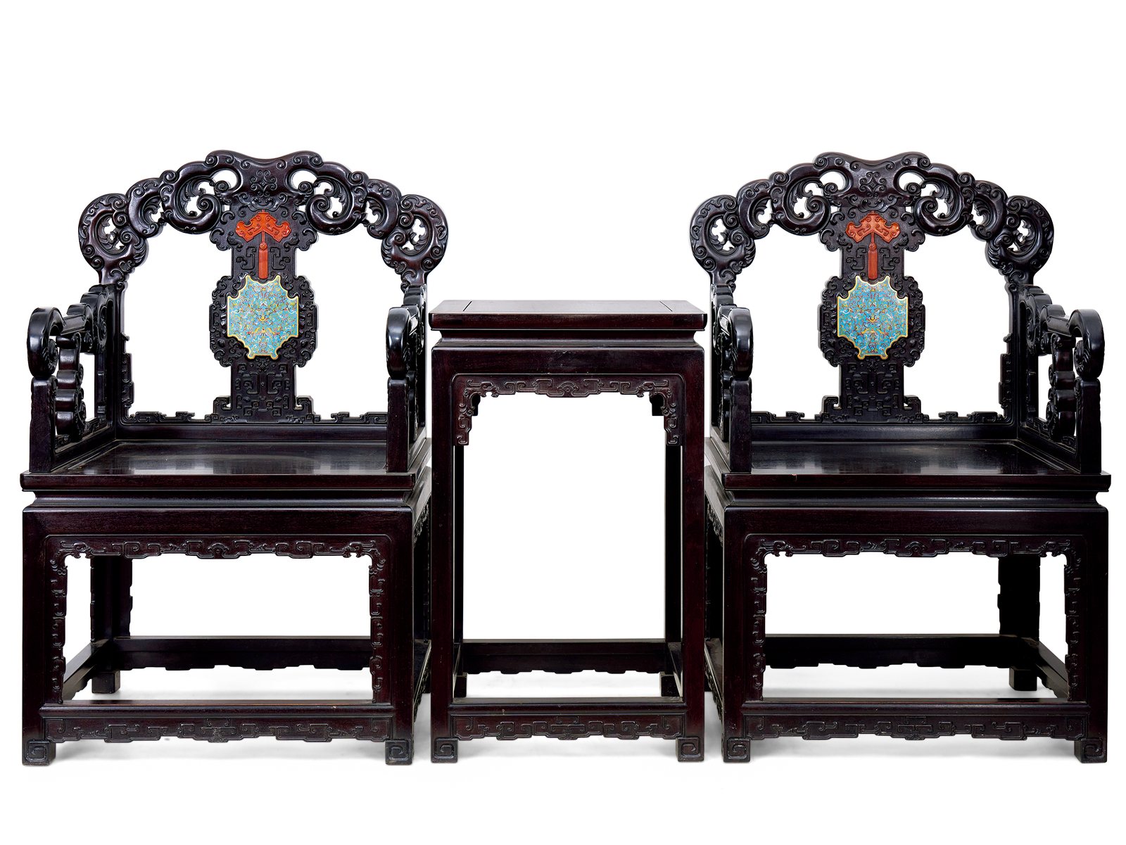 520 檀木嵌景泰蓝黄杨太师椅一组三件