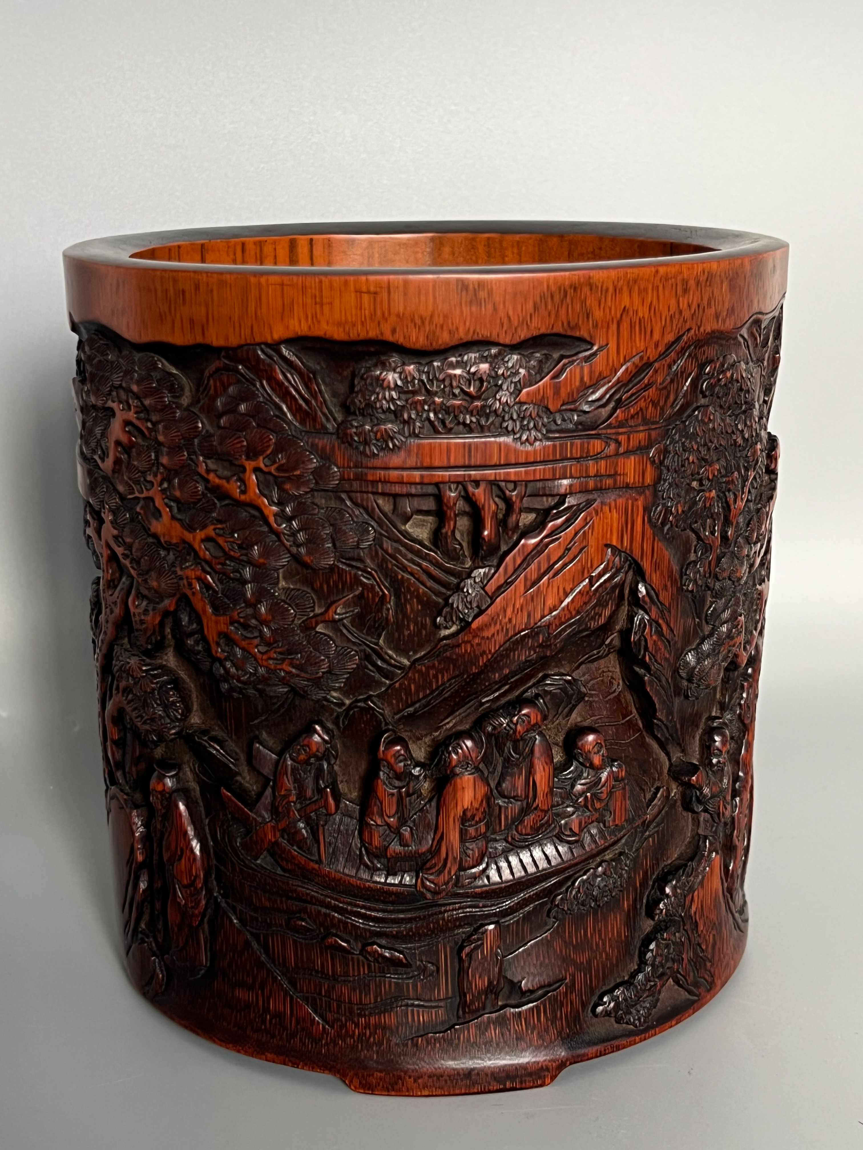 1001 王之羽款竹雕游春图笔筒