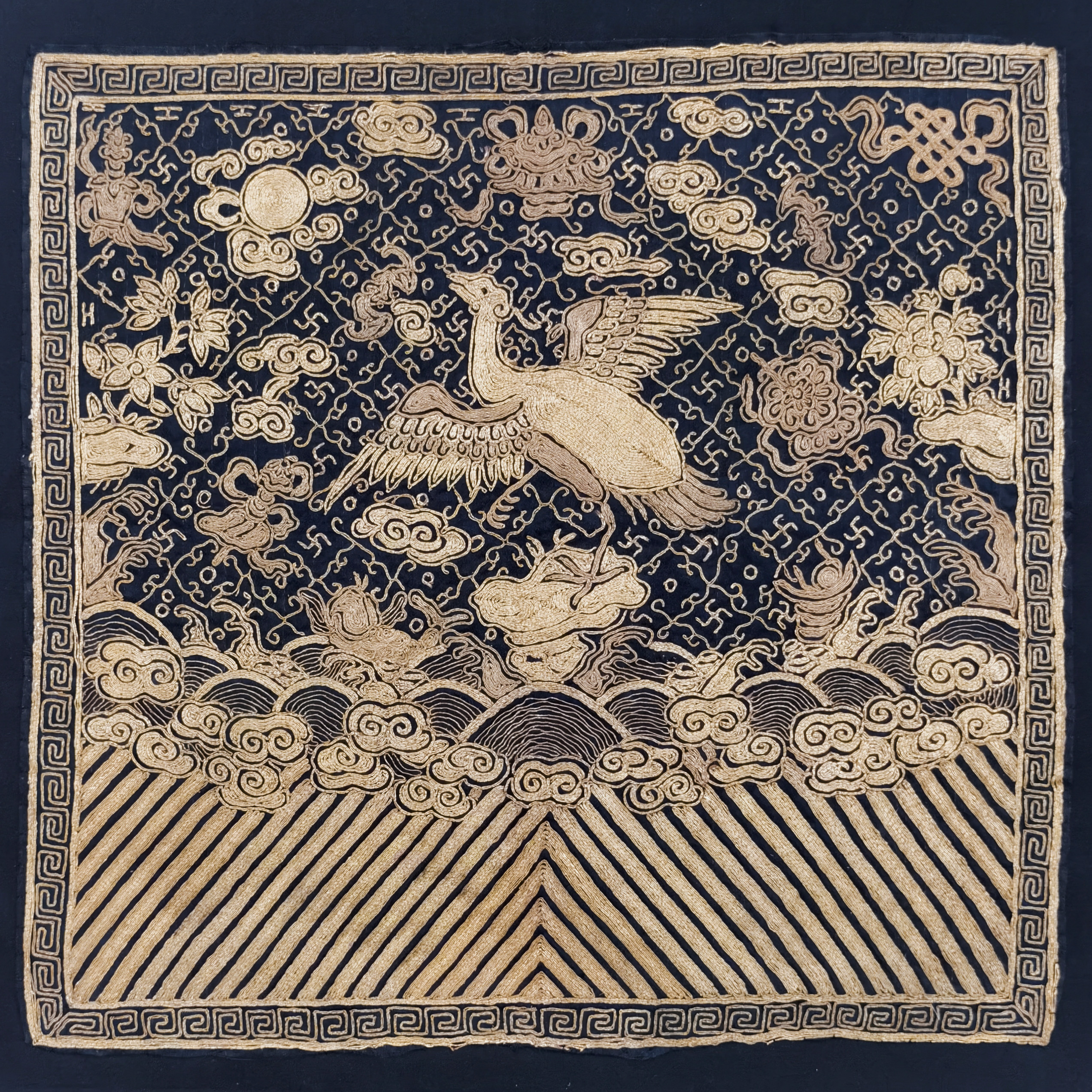 3090 缂金地缂金带孔雀羽线龙纹袍片一幅