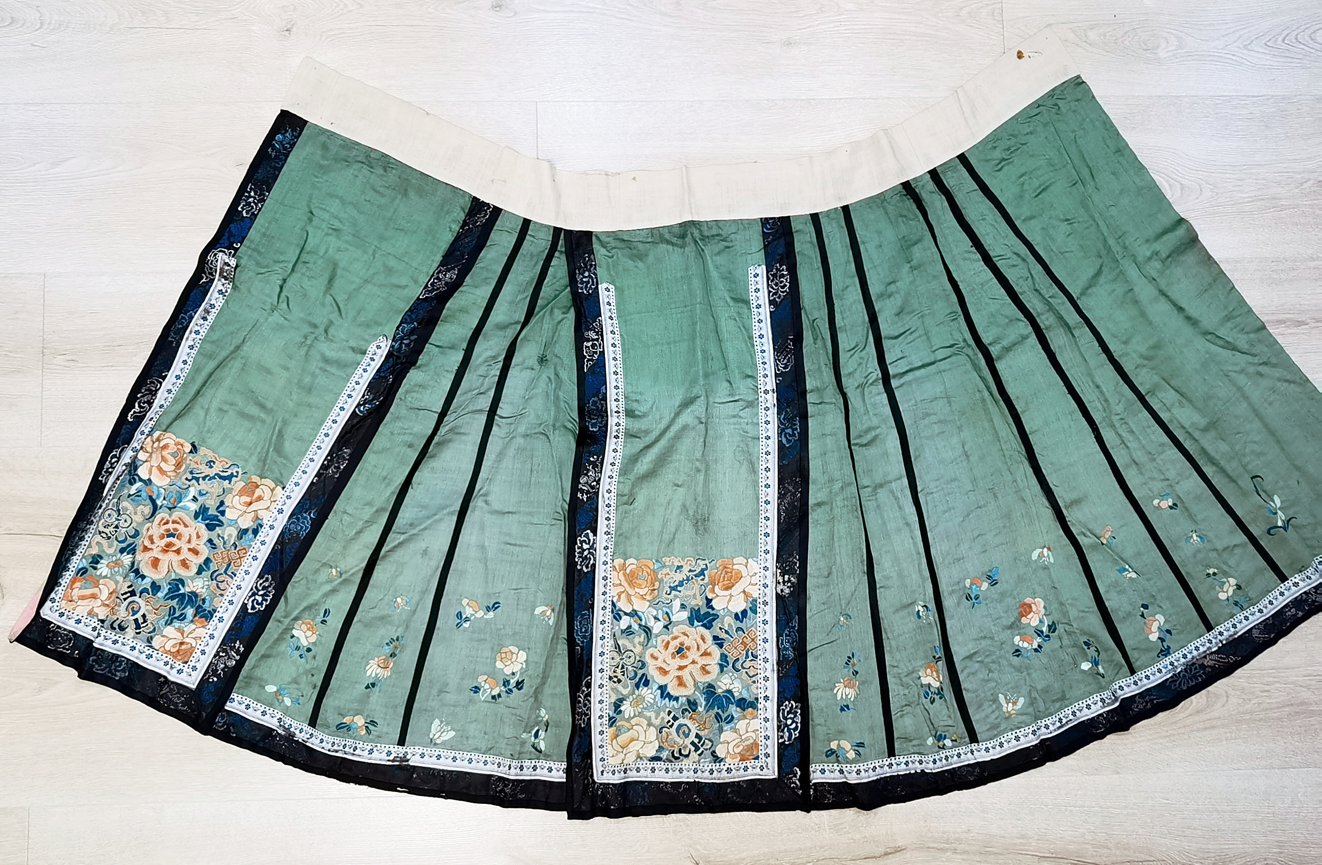3096 绿绸地打籽绣牡丹八吉祥马面裙