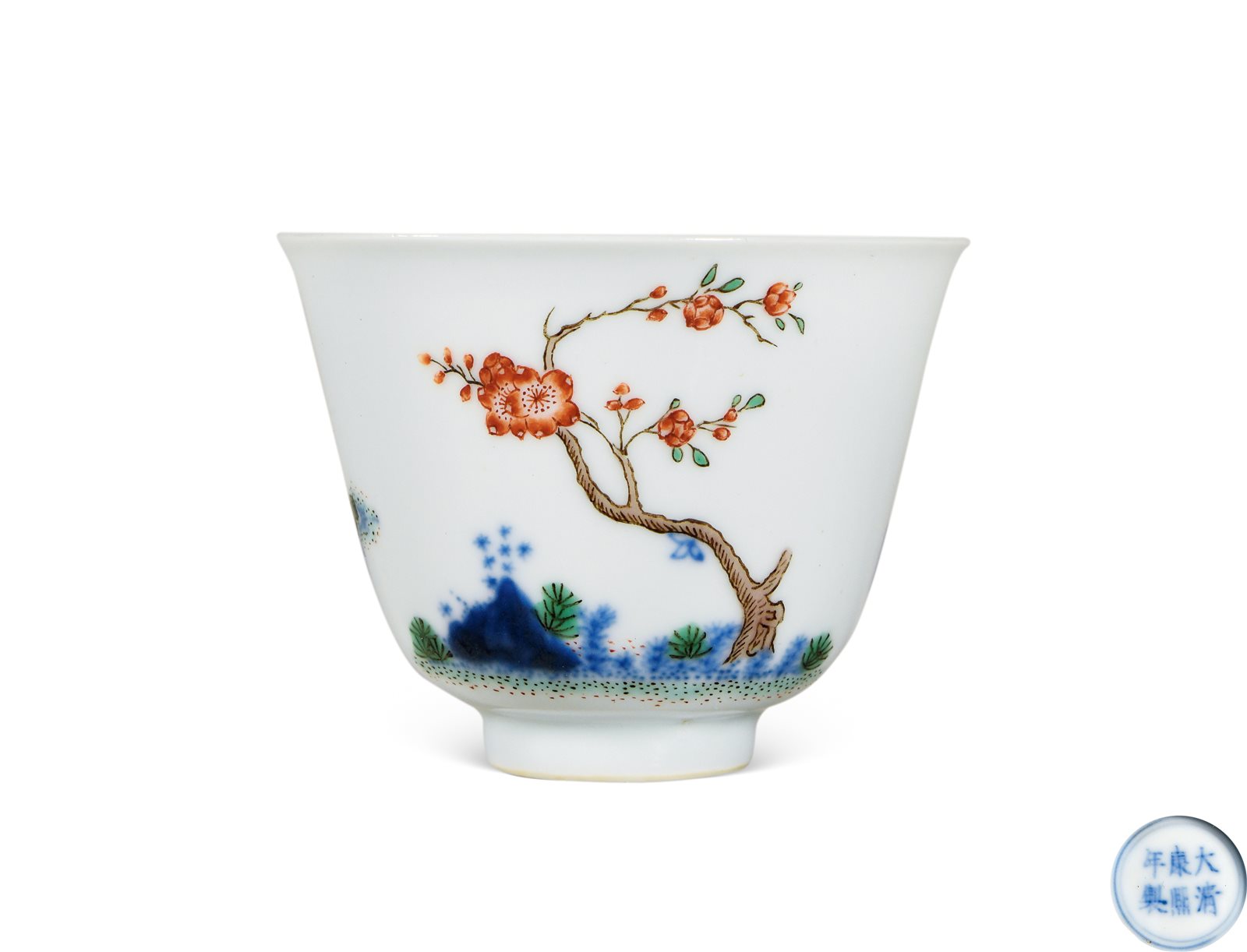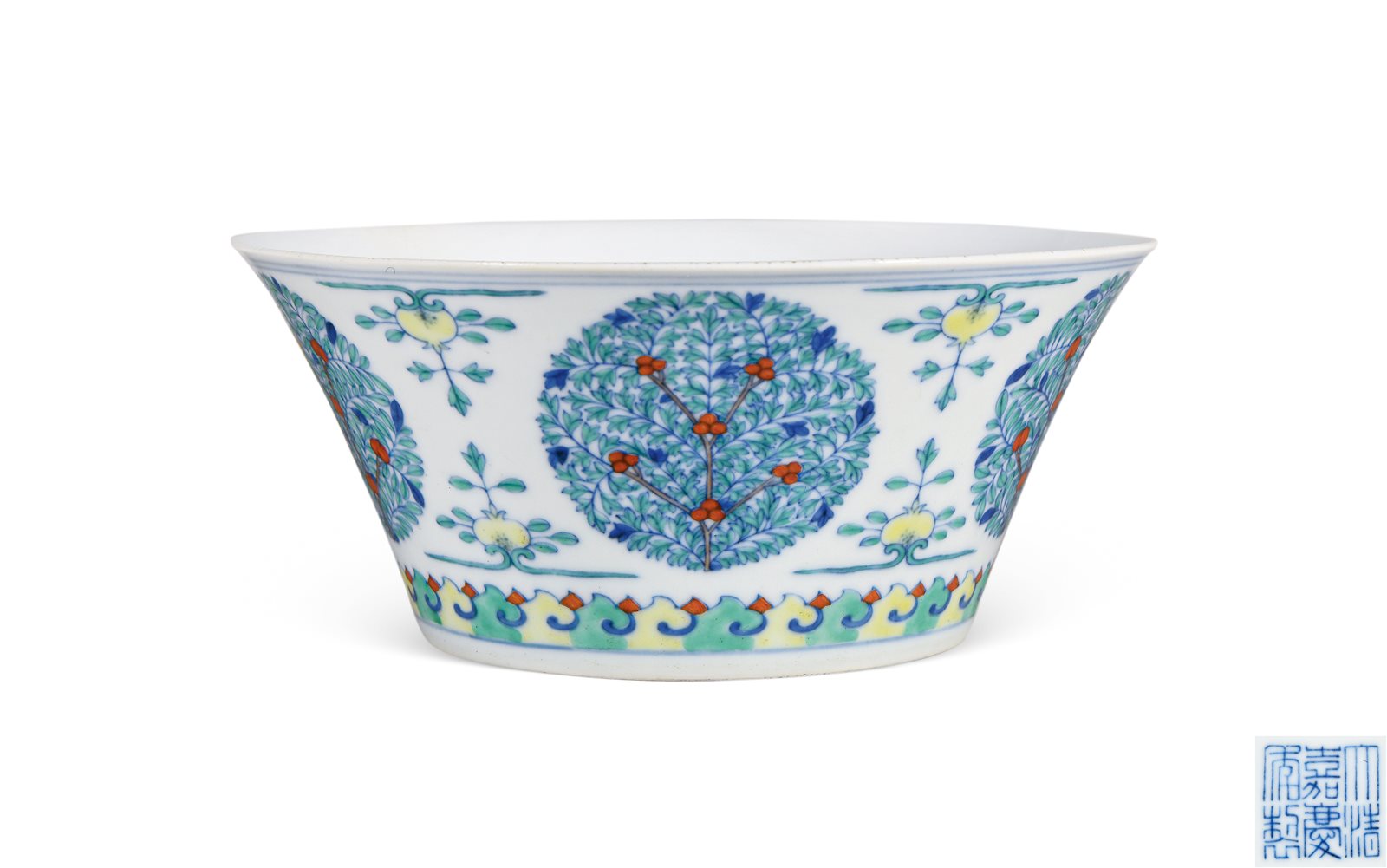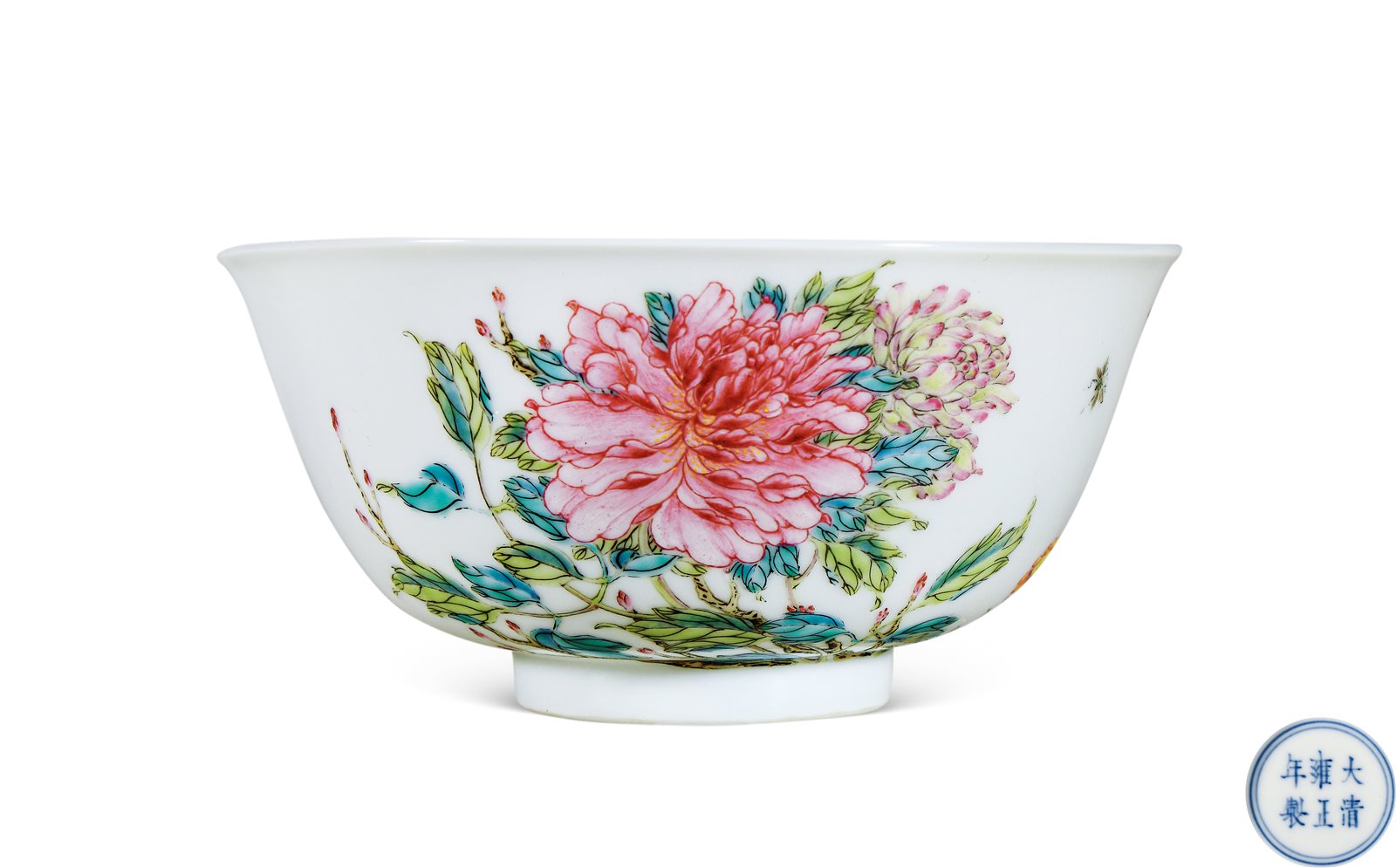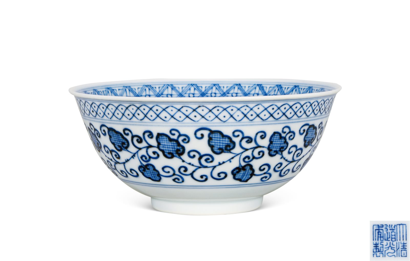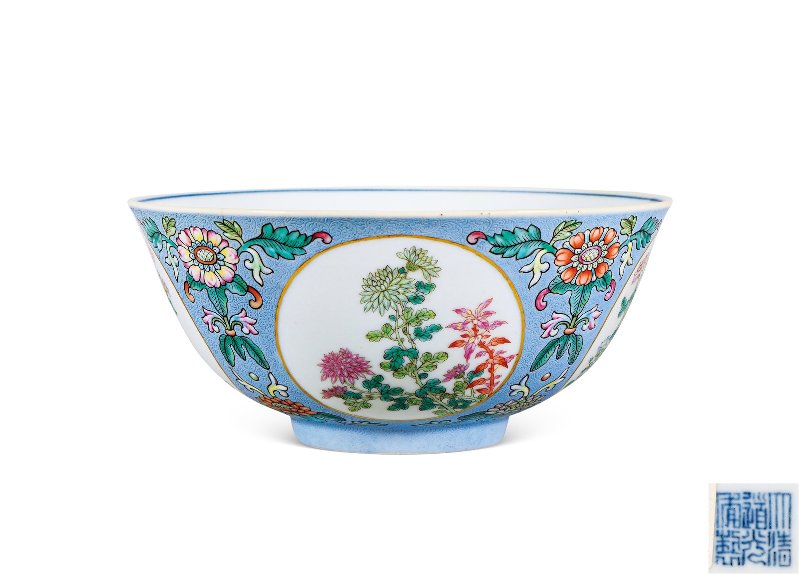 149 内青花外蓝地轧道洋彩开光「重阳菊艳」节令膳碗