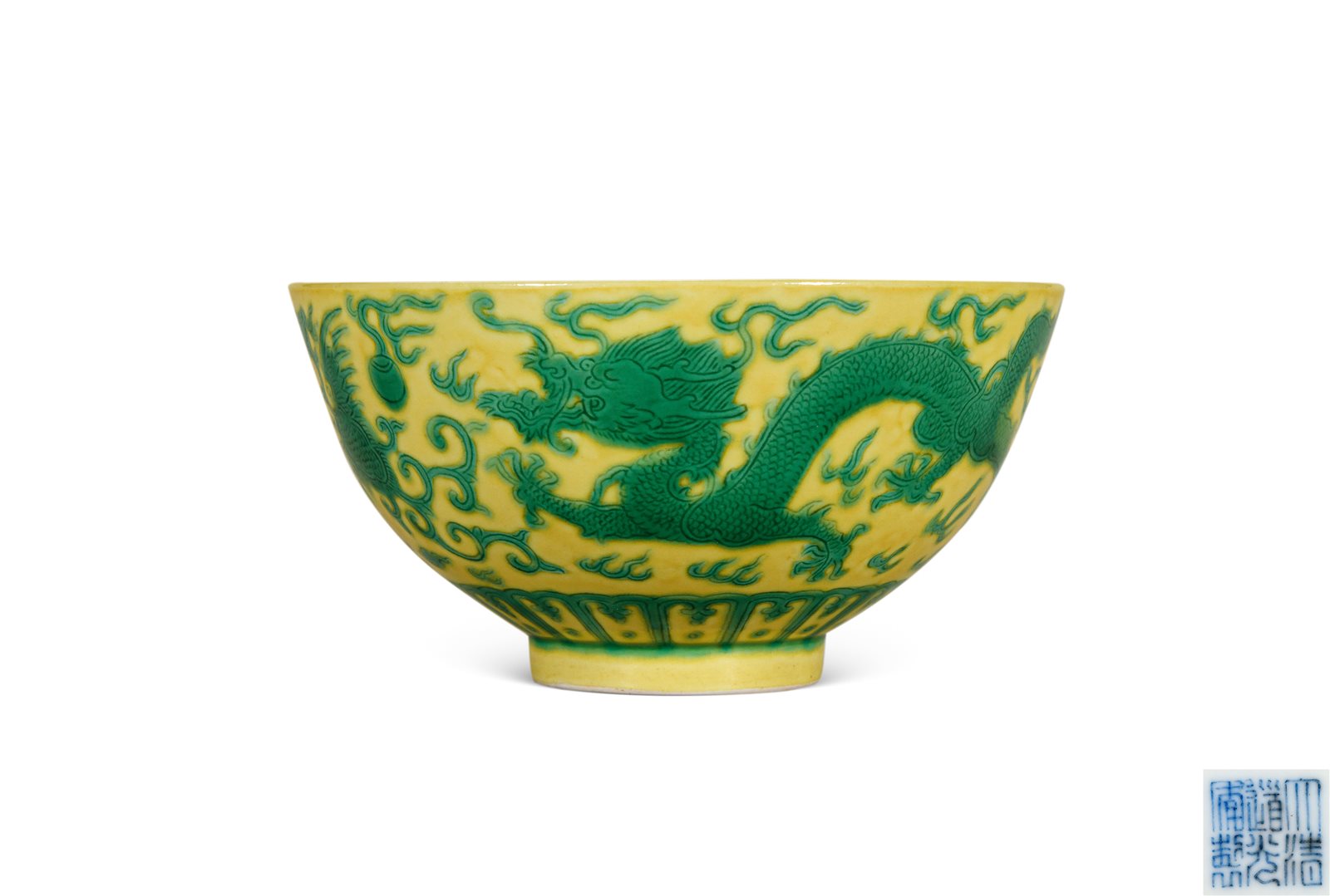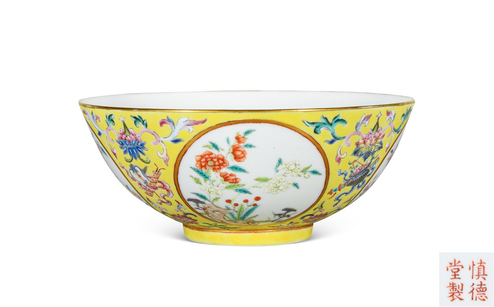 150 黄地缠枝莲托暗八仙开光四季花卉宫碗