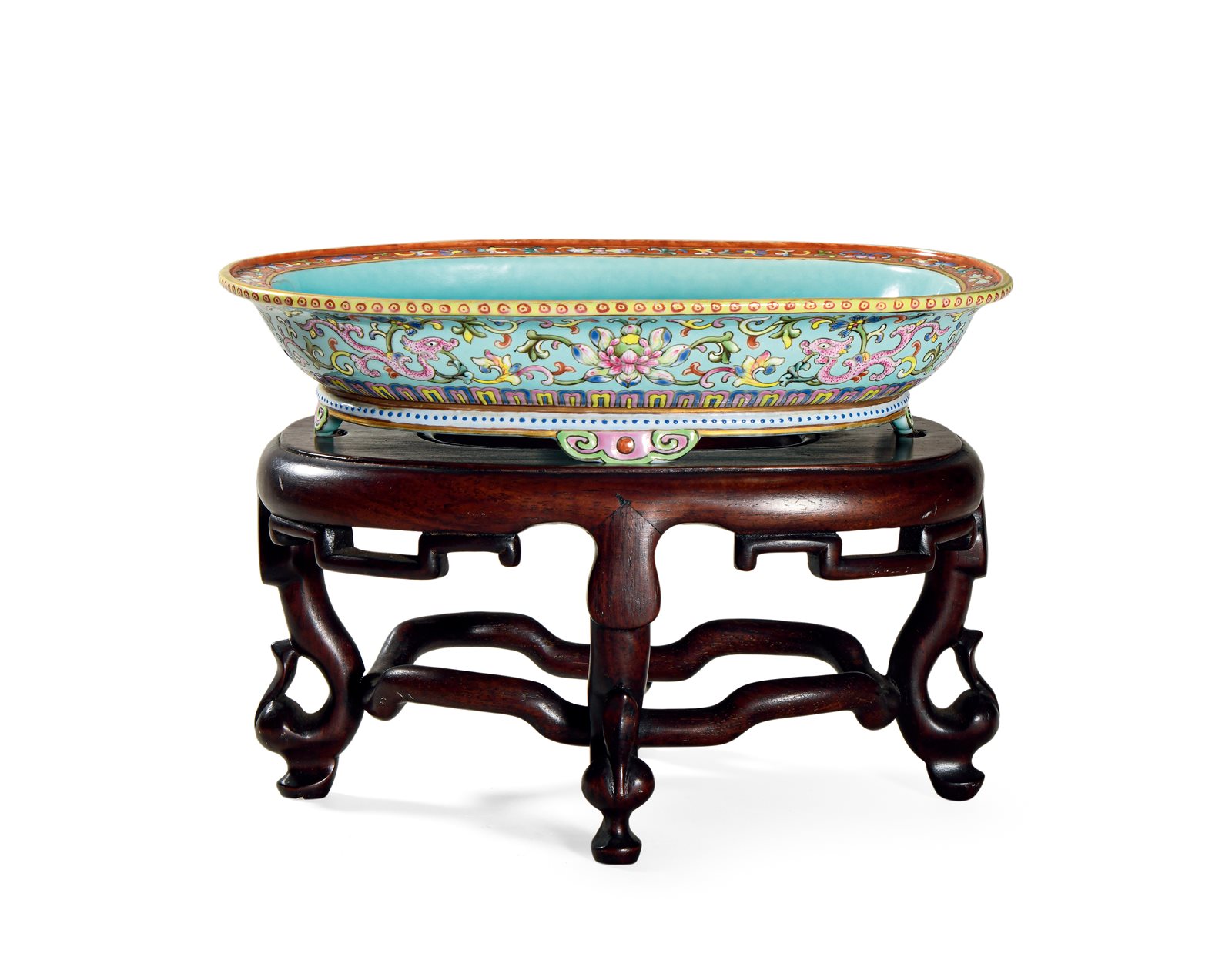 163 洋彩松石绿地缠枝莲夔龙纹盆托