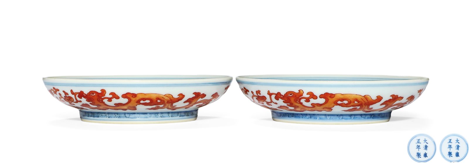 495 矾红彩夔龙纹小碟一对