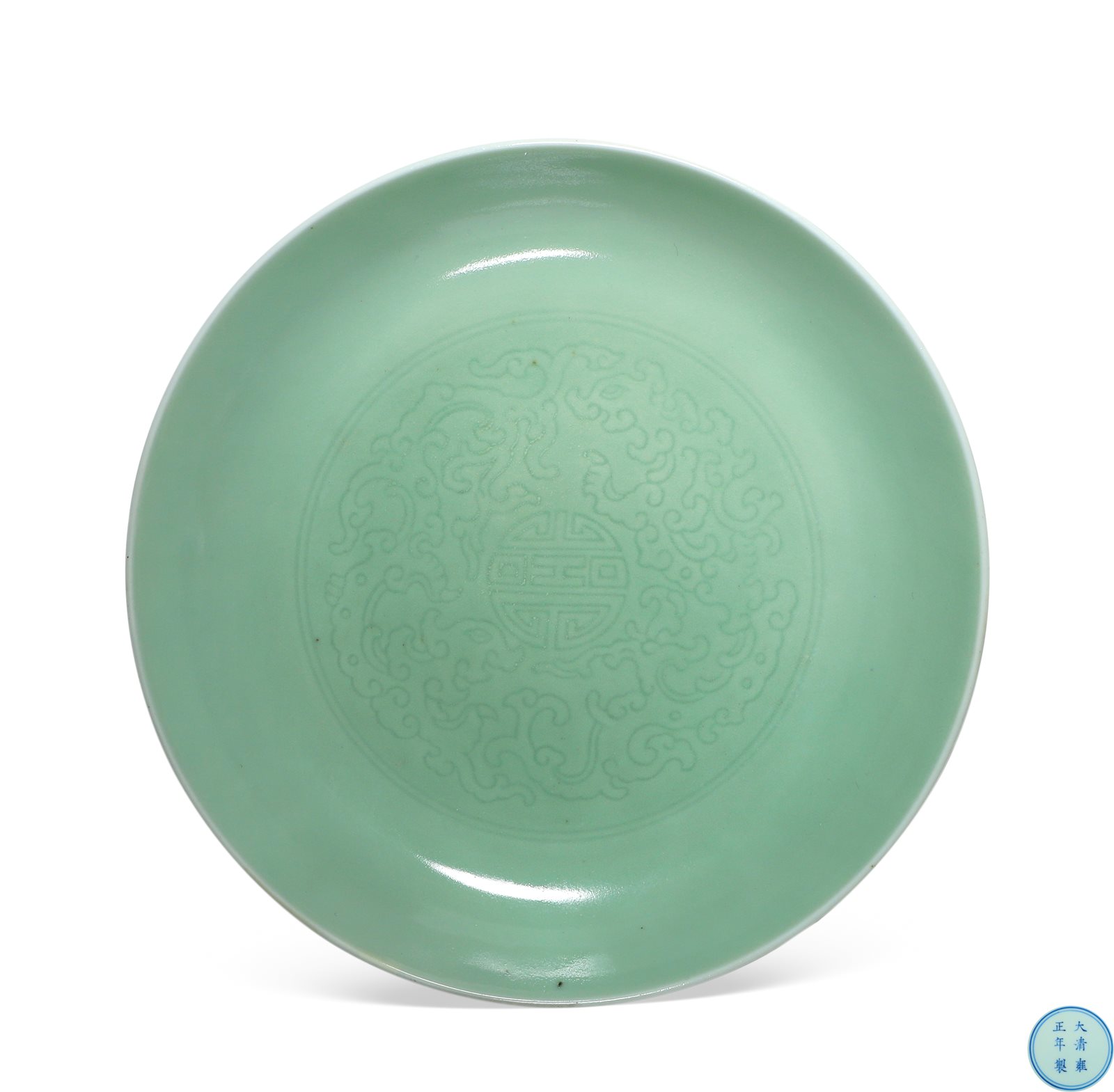 499 青釉暗刻夔龙捧寿纹盘