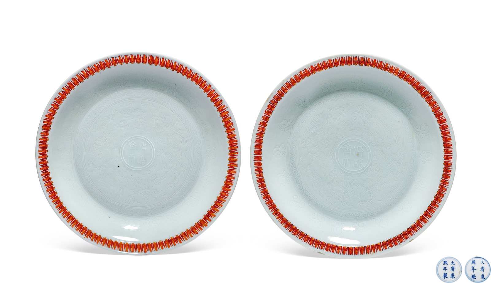 506 矾红彩洪福齐天暗刻龙纹盘(一对)