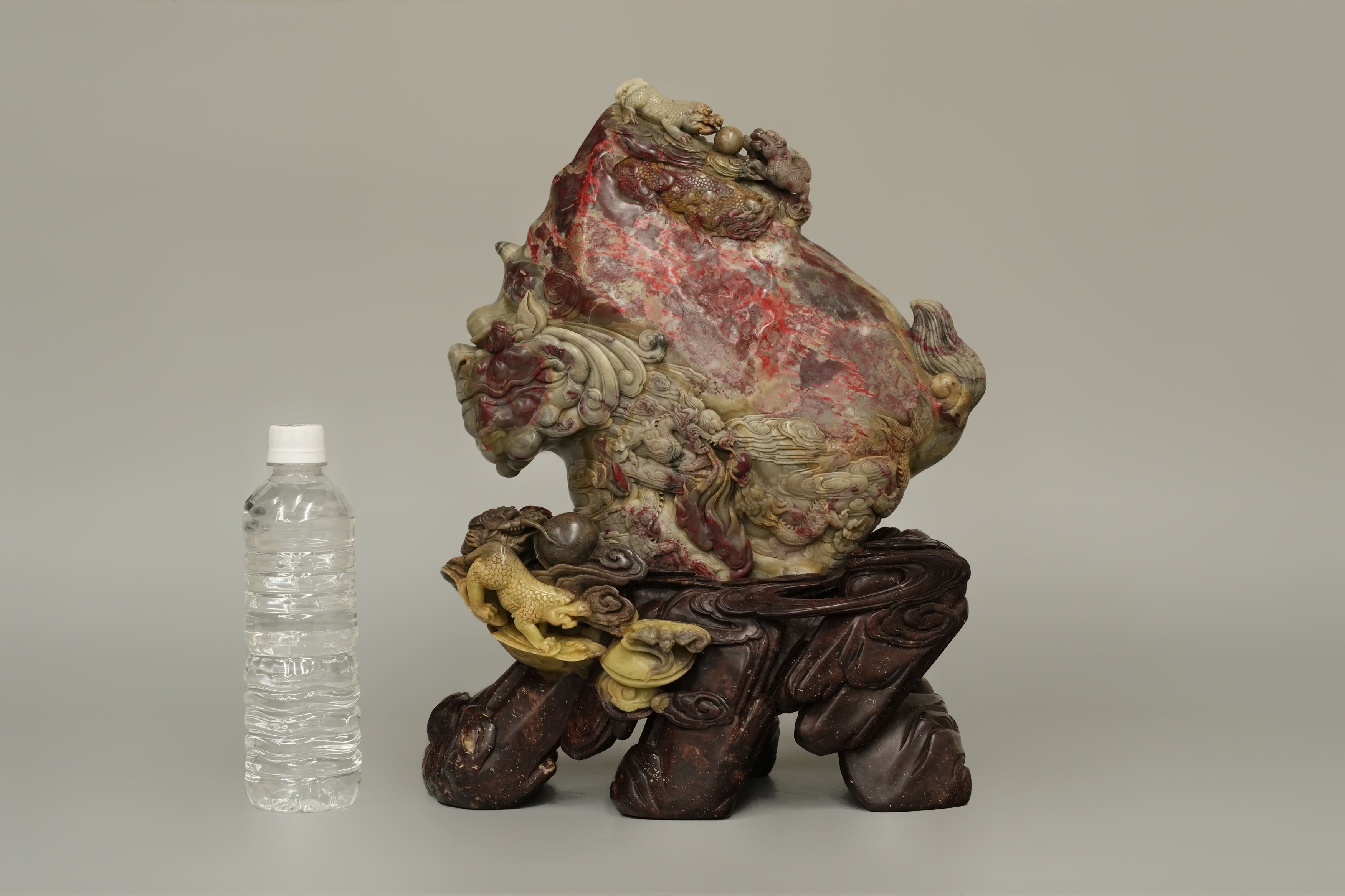 尺寸:含托高约39.5cm 本体高约29.5cm 幅宽约25.3cm 纵宽约8.5cm 鸡血石重约8kg