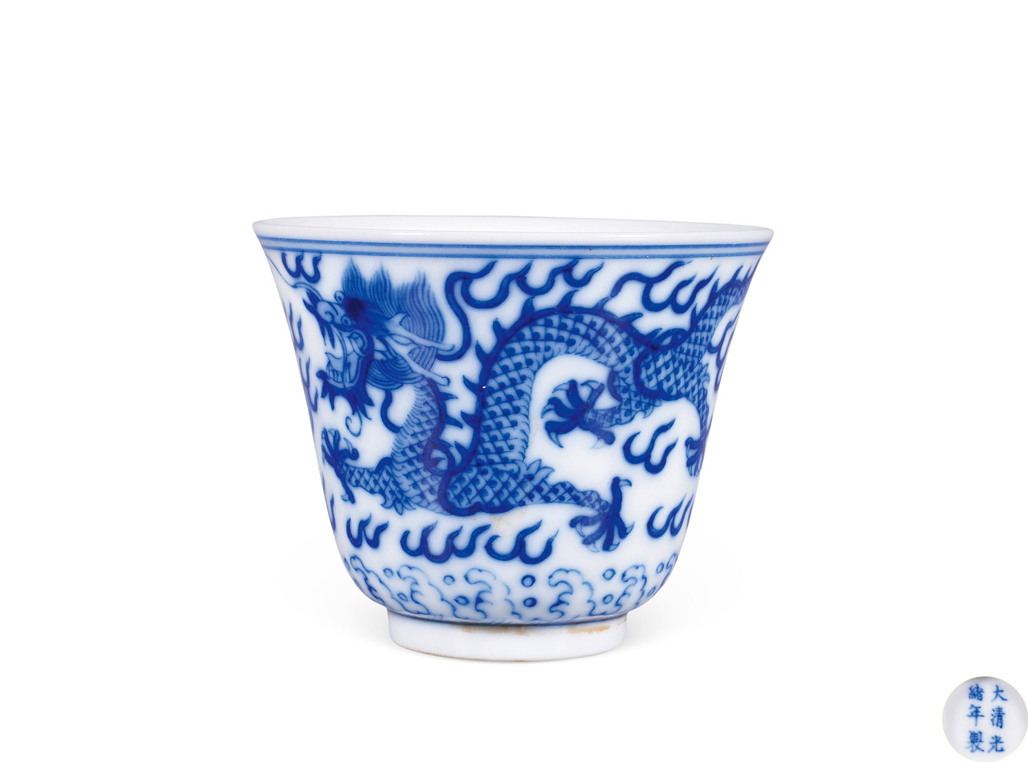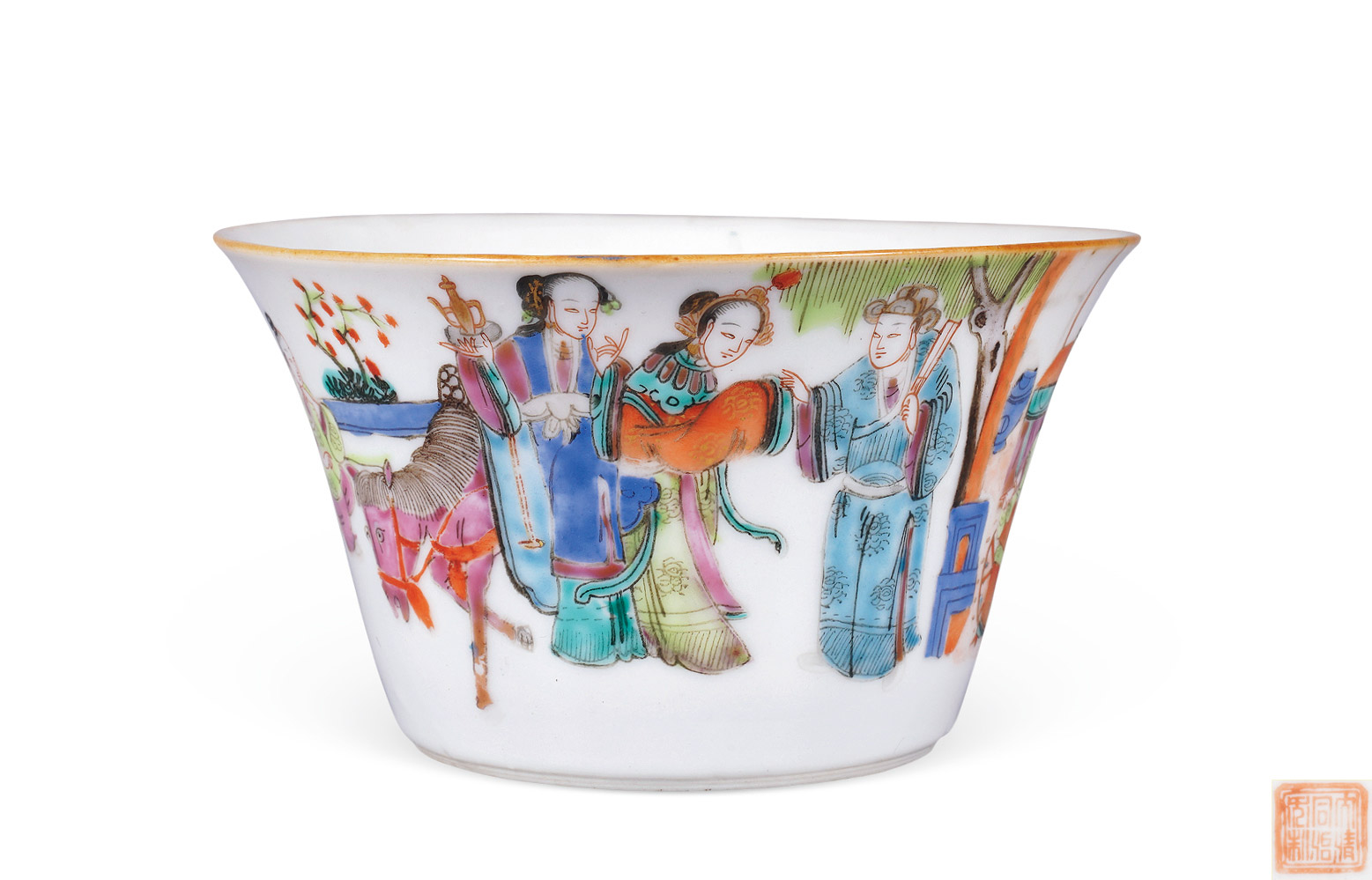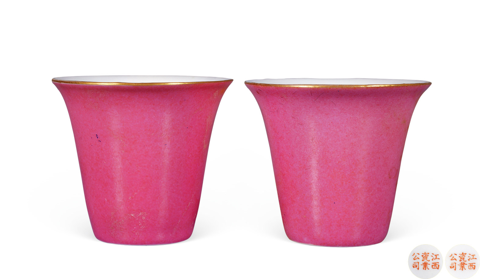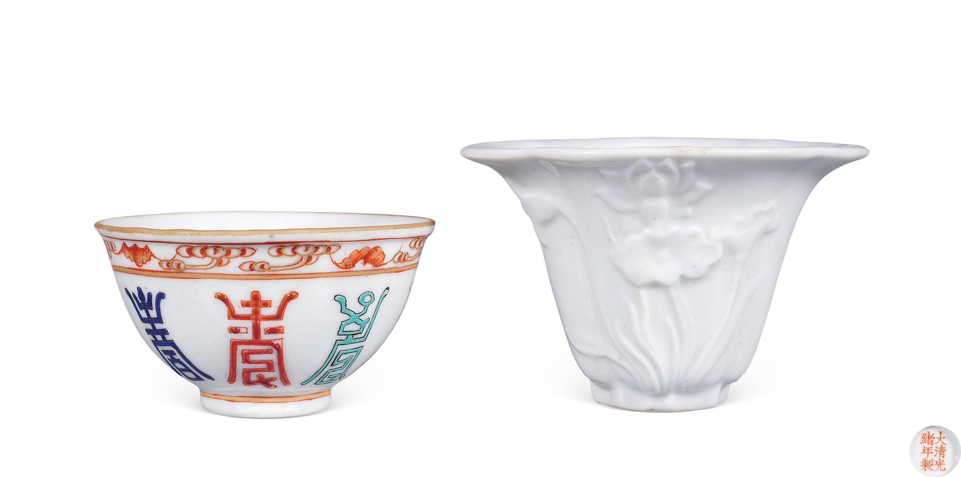 1014 料彩五福捧寿小杯、德化花口杯(一组2件)