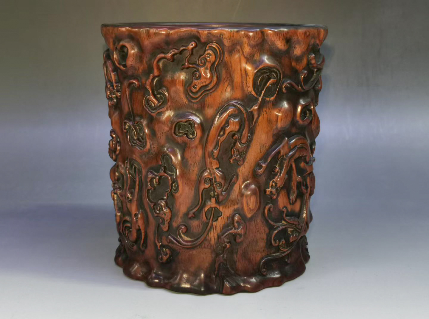 5003 黄花梨刻灵芝螭龙纹笔筒