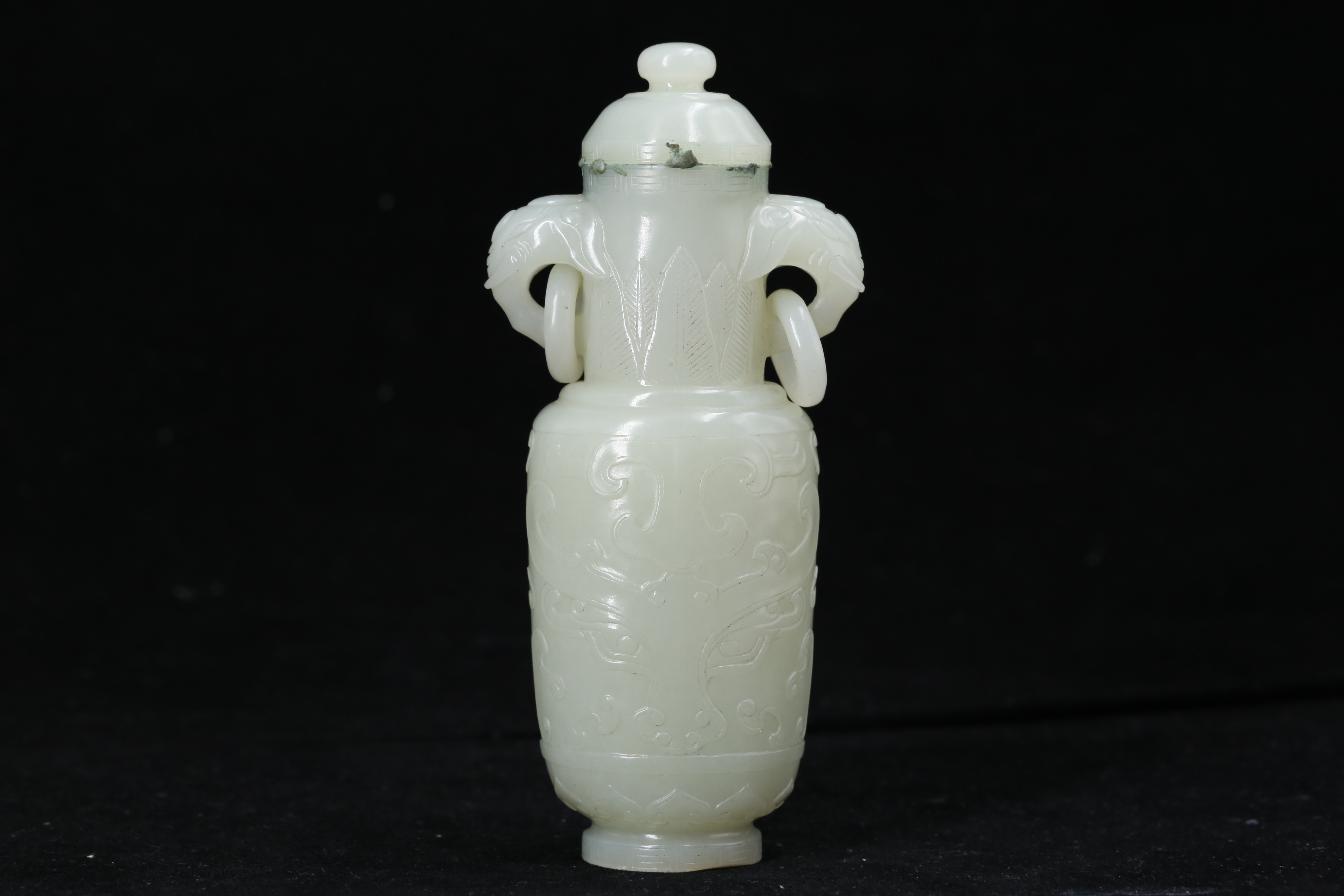 5165 白玉籽料刻兽面蕉叶纹双象活环耳赏瓶