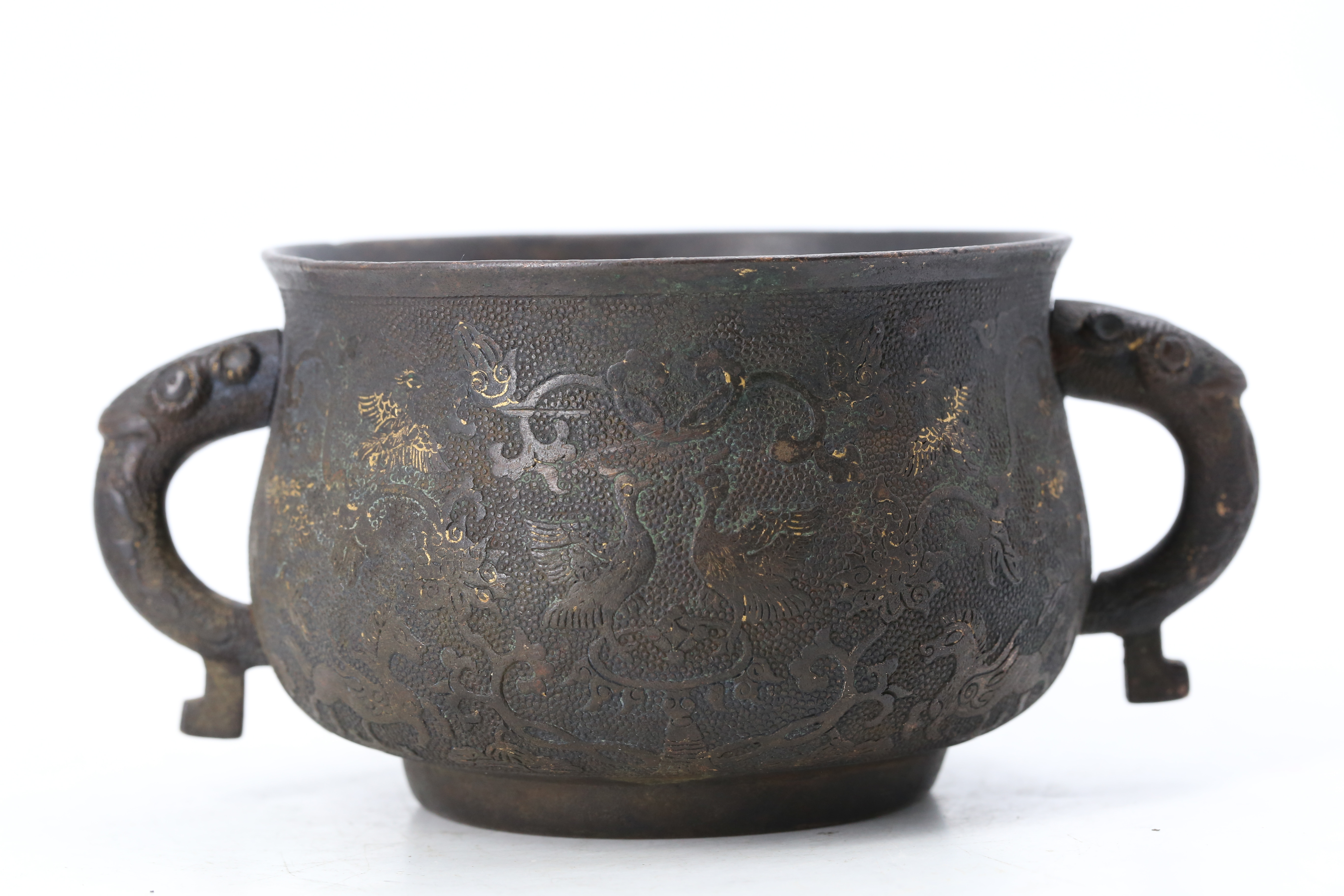 1017 铜鎏金錾刻珍珠地神兽纹蛇首耳炉