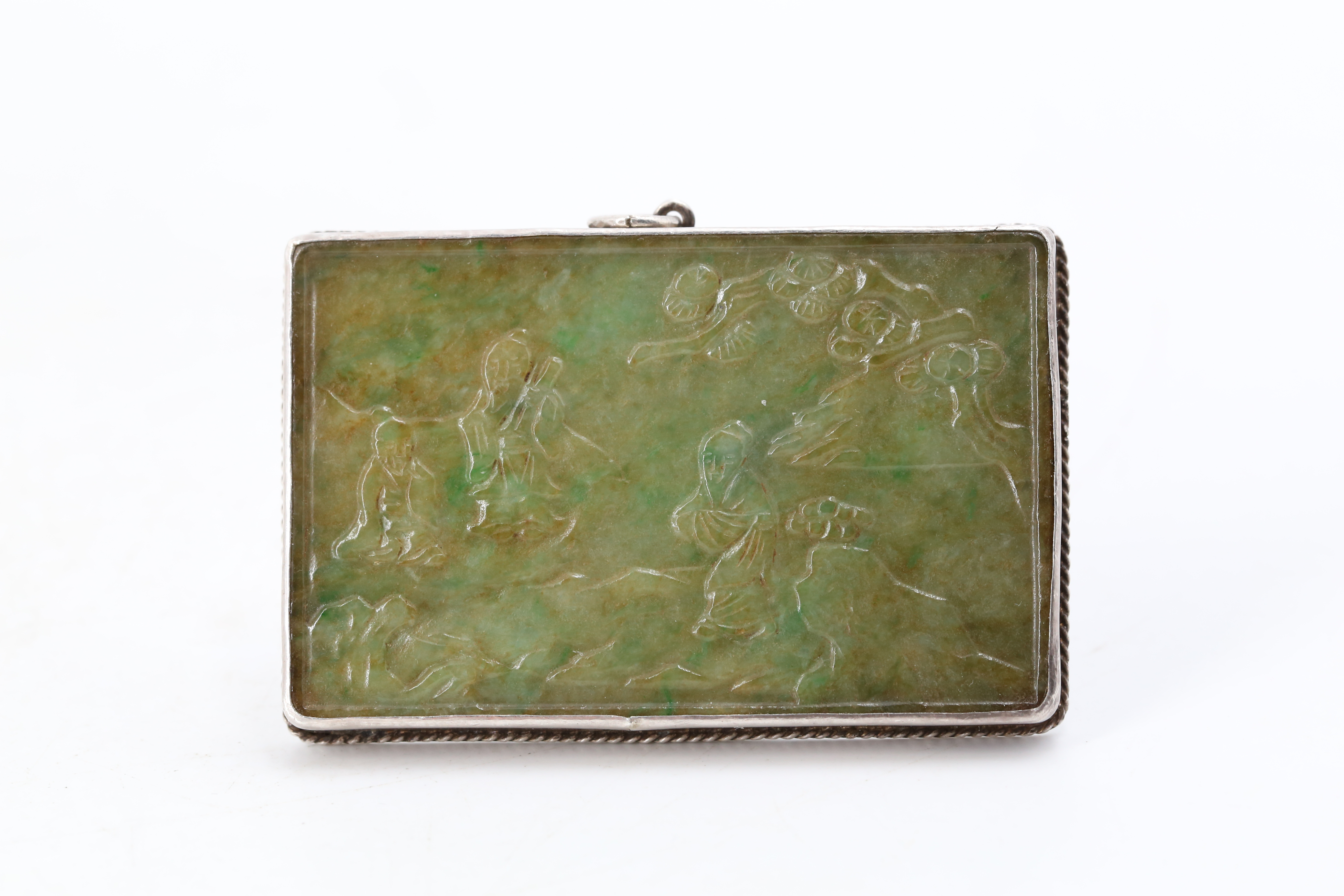 1118 天宝纹银款翡翠包银刻松下高士图方牌