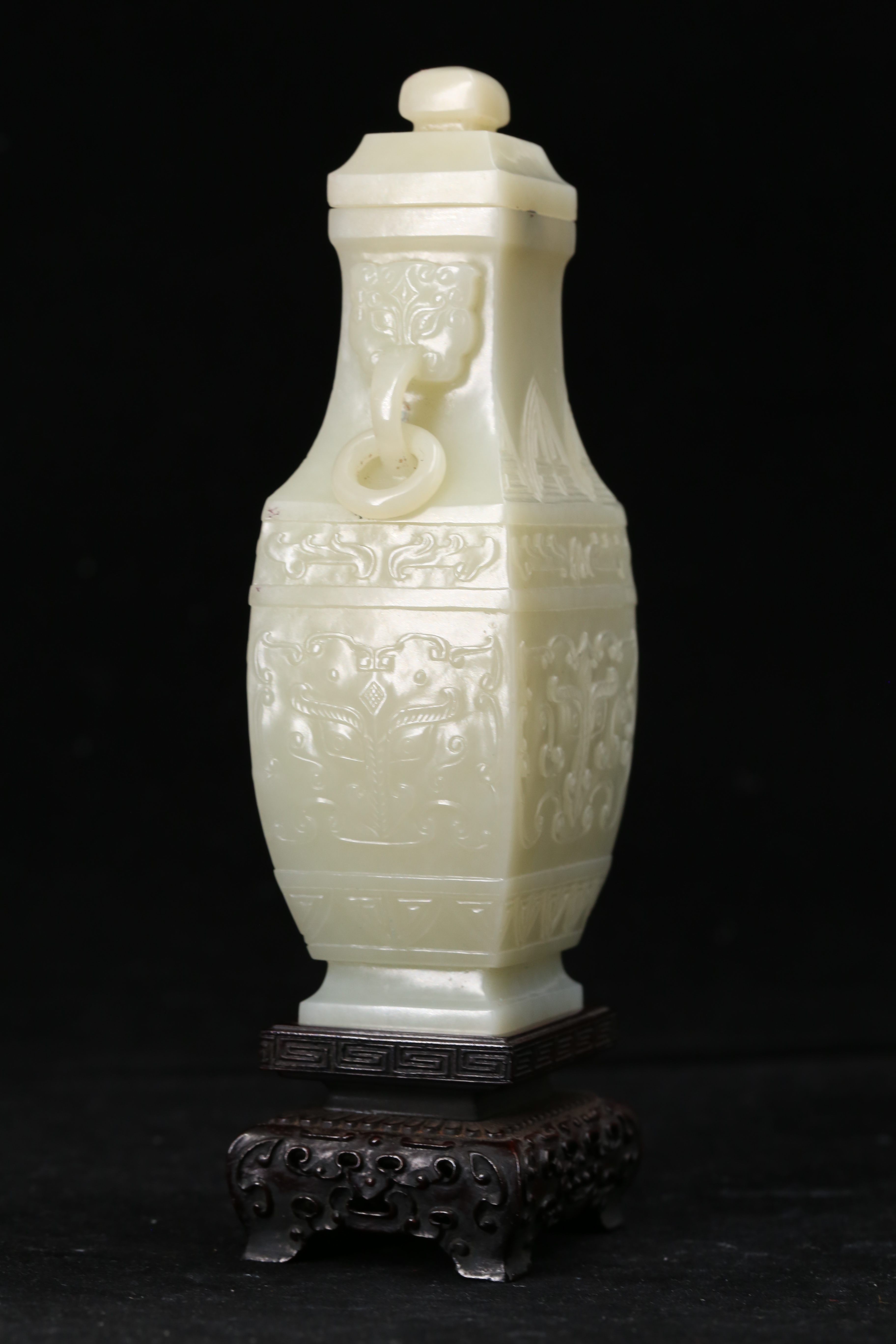 2167 白玉籽料刻饕餮纹双环耳方瓶