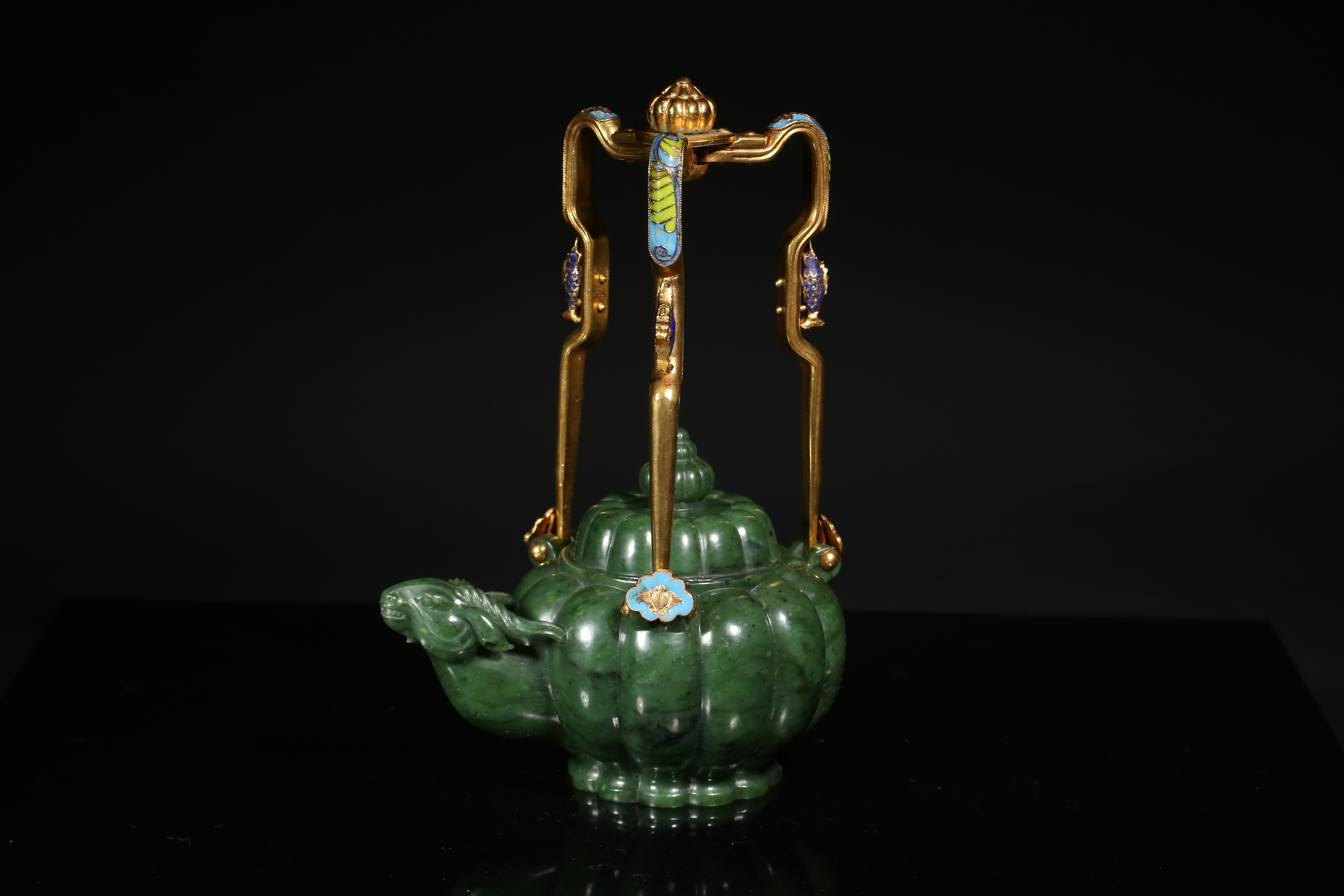 4540 痕都斯坦工碧玉羊首景泰蓝提梁壶