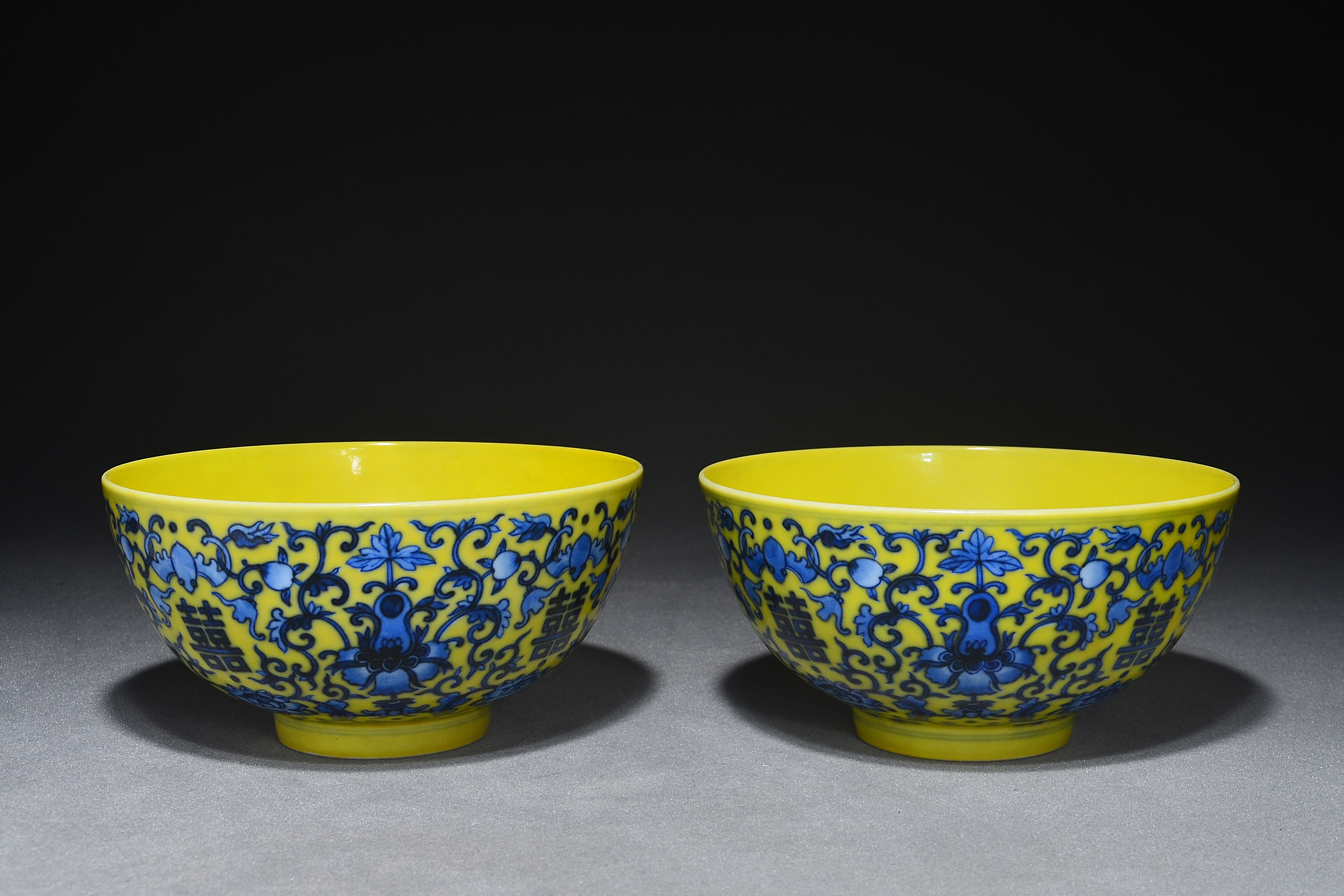 4554 内外黄釉青花缠枝莲双喜碗一对